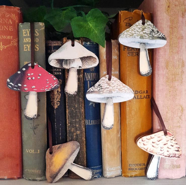 This set of mushroom hanging decorations are handmade from birch wood and feature 6 different vintage style images extracted from antique books and cards. The images have beautifully muted colours giving a delightfully nostalgic feel. Each image is decoupaged on both sides of each mushroom, so the design can be seen from either side when they’re hung up.