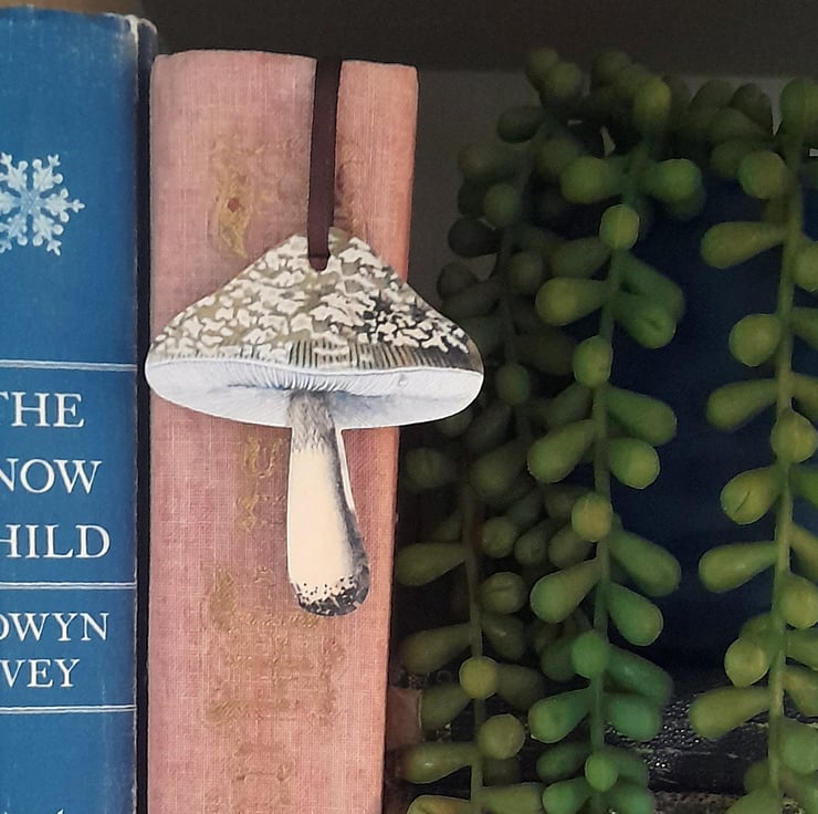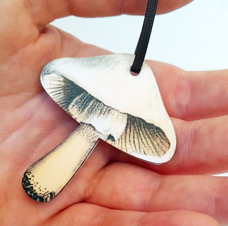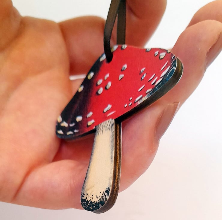 The hanging decorations are made from precision cut natural birch wood. Strung with 3mm satin ribbon, ready to be displayed. Each mushroom measures 6cm tall (excluding the ribbon) and approximately 5.3cm at the widest point. They are 3mm thick.