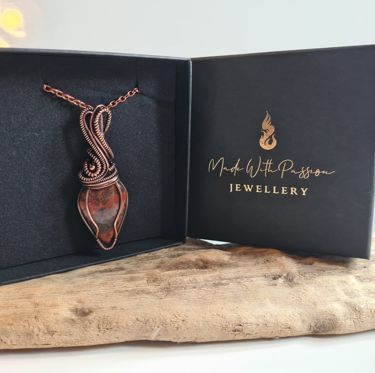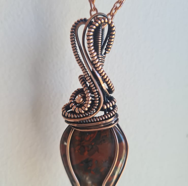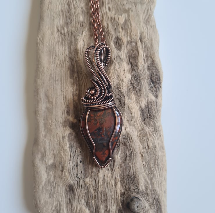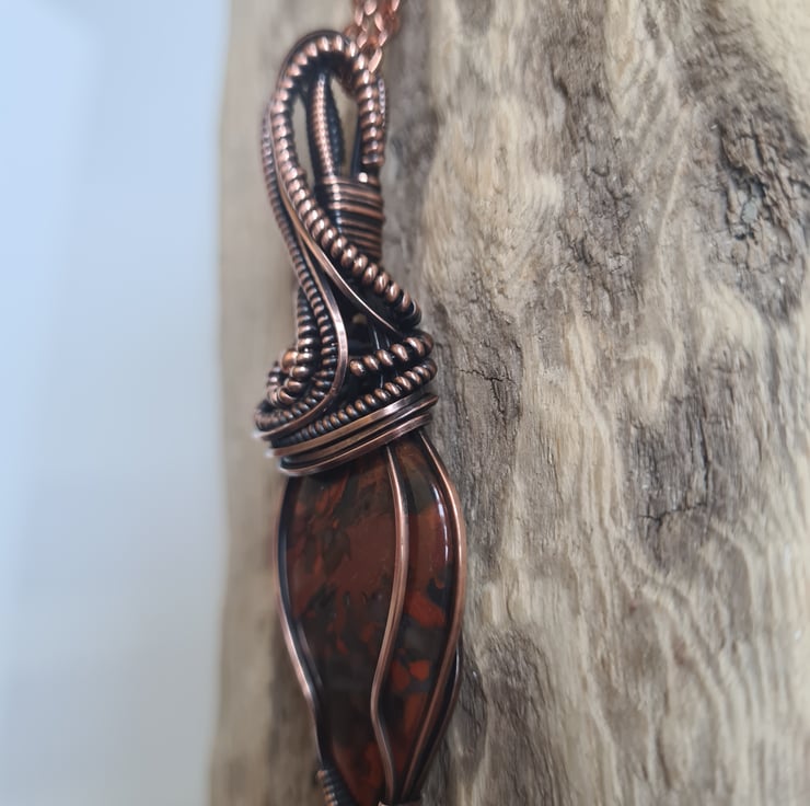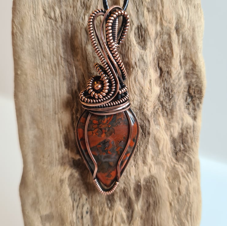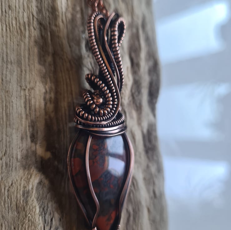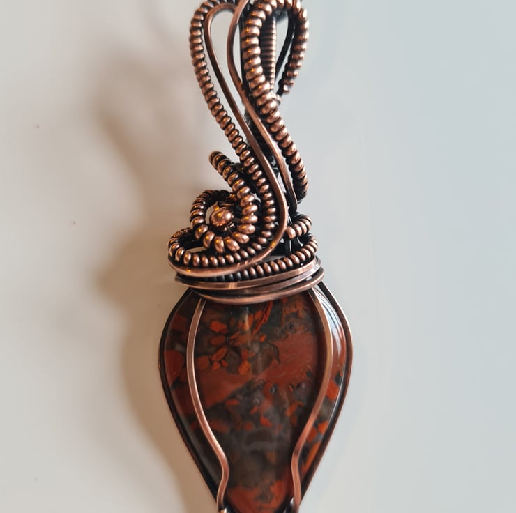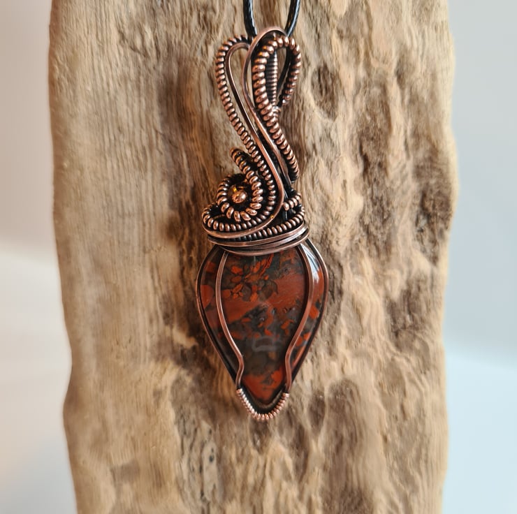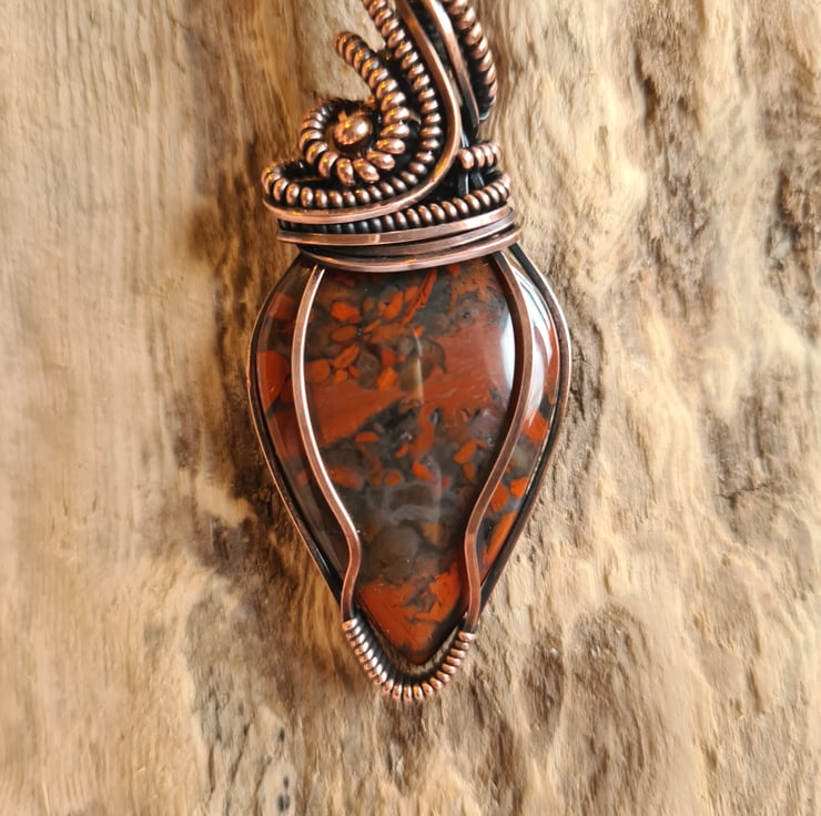 A stunning red Brecciated Jasper natural stone wrapped by Katie West in raw pure copper and then antiqued and polished for the final effect.