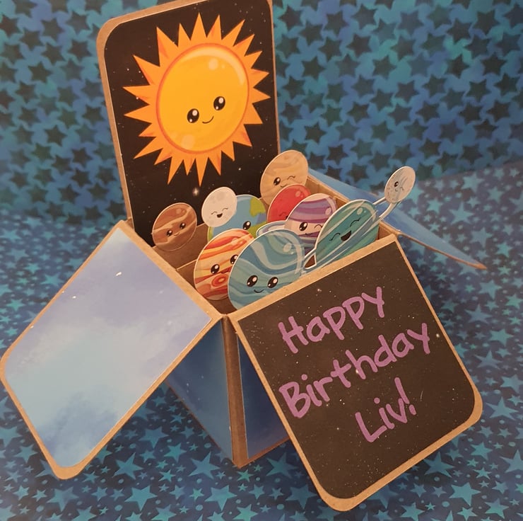 The card is 14 cm x 14 cm when laid flat and fits into the envelope provided. The card base is kraft card and has been topped with space themed paper and decorated with die cut planets. The outside of the card has been decorated in multi coloured space themed paper and the front panel reads Happy Birthday Liv.