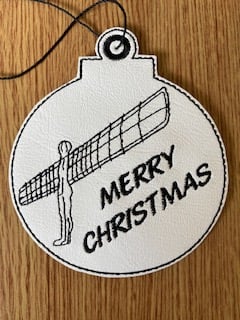 Angel of the North Merry Christmas tree hanger made from vinyl and backed with felt. Machine embroidered details.