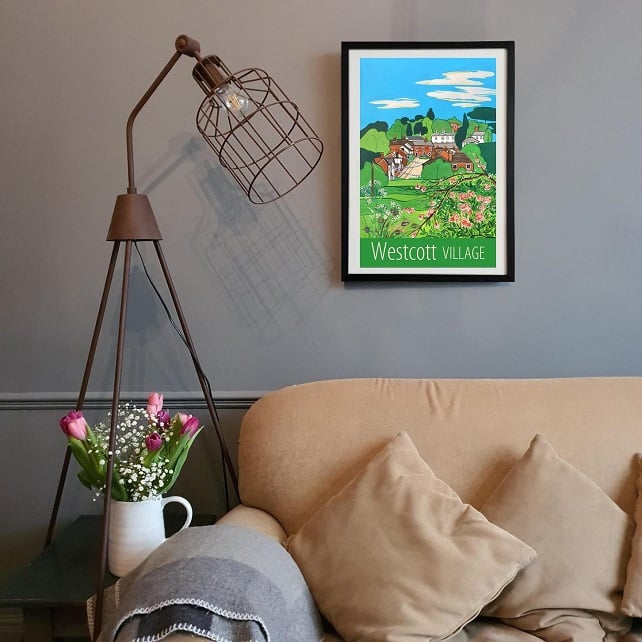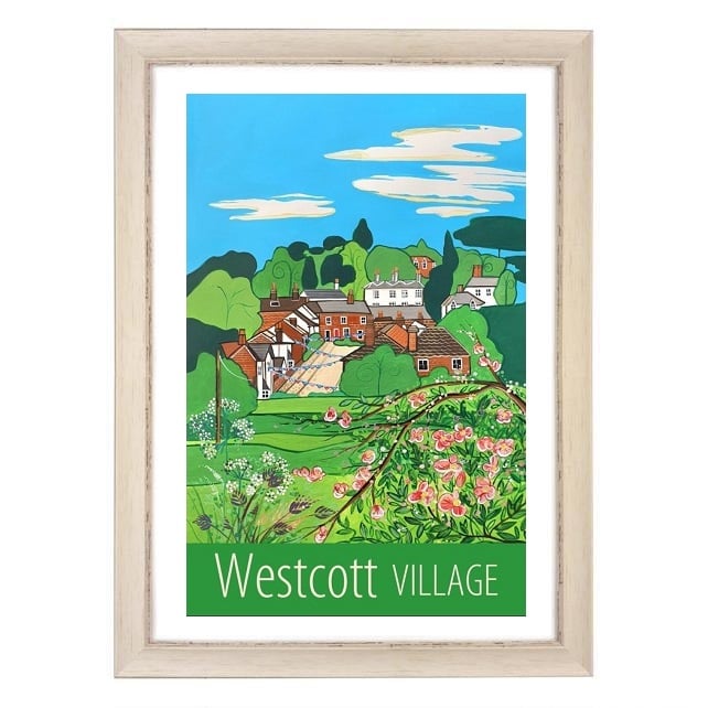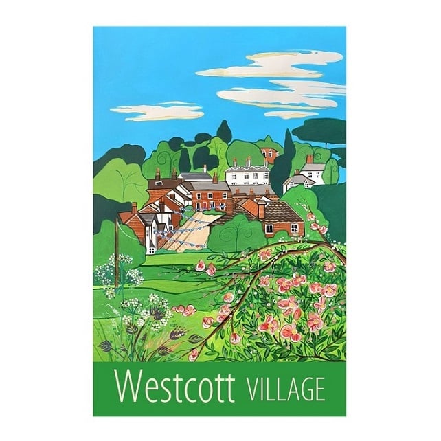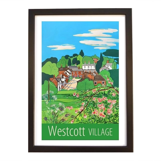 A contemporary travel poster style print of lovely Westcott Village, in Surrey, from my own original acrylic painting.