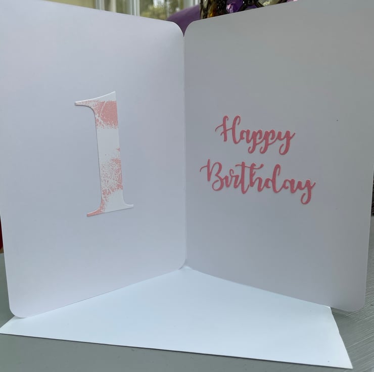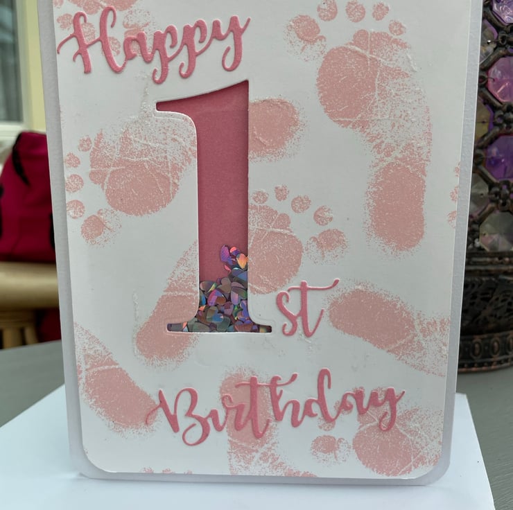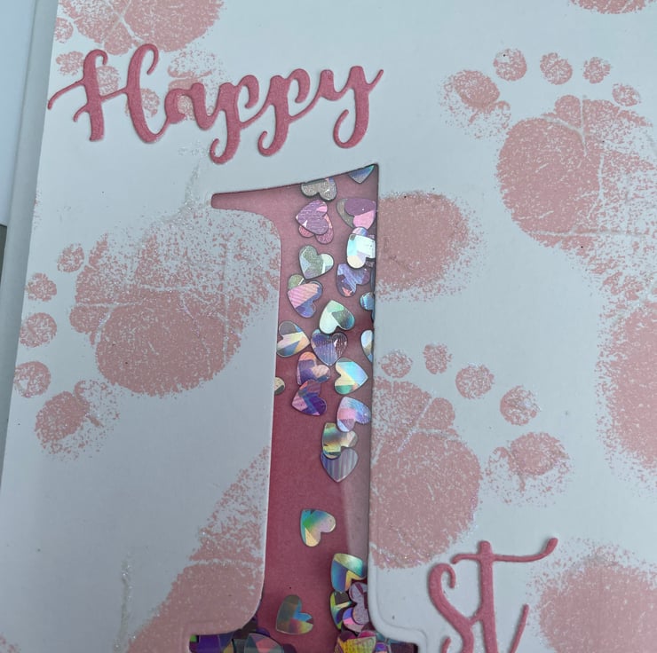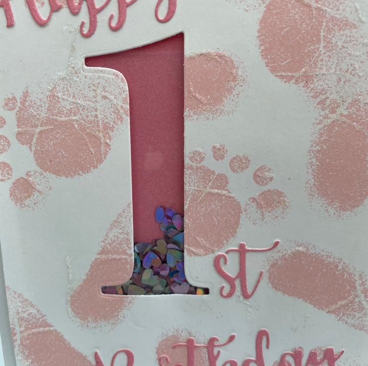 A large number 1 is cut into the card and makes the shaker element. A clear acetate window shows a matching pink background and silver rainbow holographic hearts that can be shaken. The greeting is in matching pink and says Happy Birthday. Inside the card has a matching number 1 and the greeting Happy Birthday in pink.