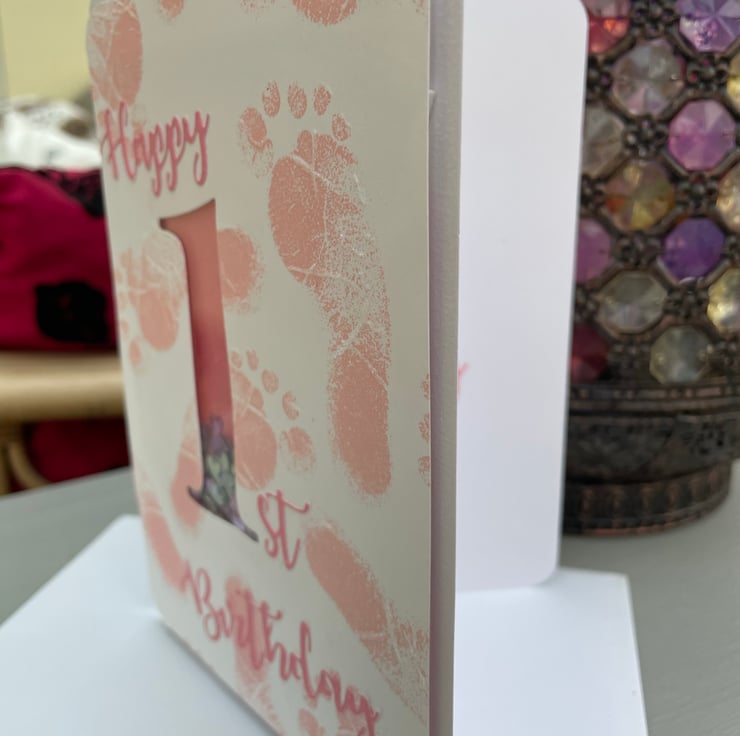 What a special birthday a first birthday is. This 17.5x12.5cm sized card is a beautiful way to celebrate. The front of the card features pink footprints embellished with clear glitter.