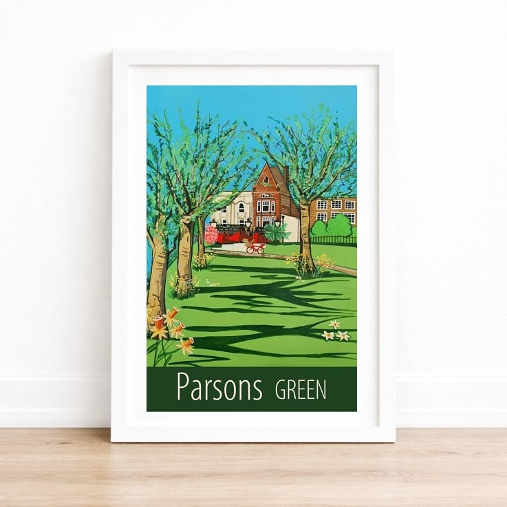 A contemporary travel poster style print of busy Parsons Green, in London, from my own original acrylic painting. A perfect gift for those who love Parsons Green!