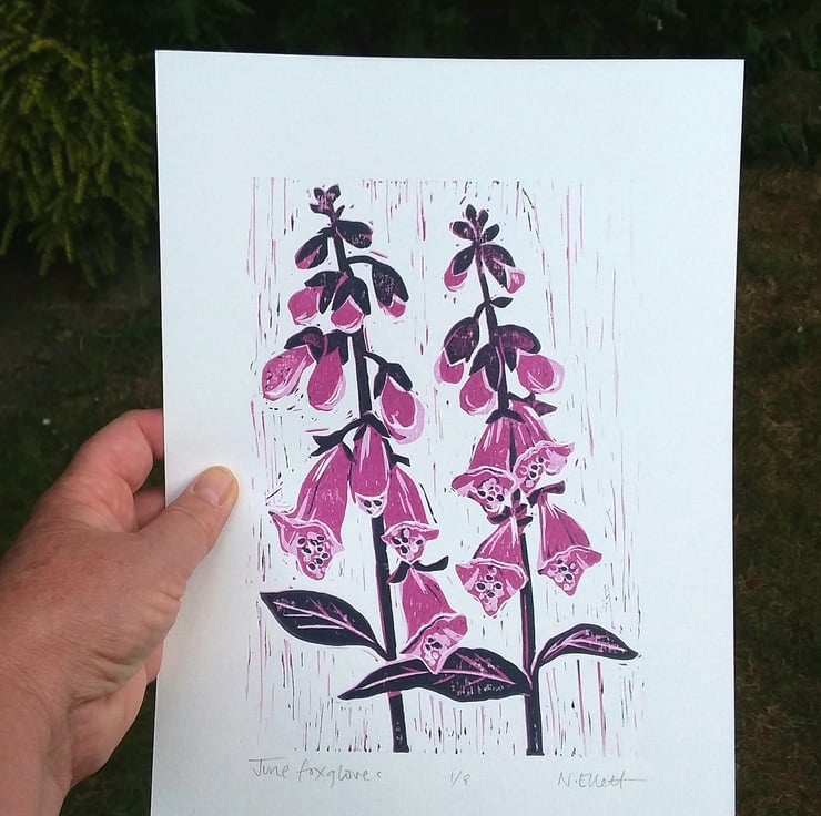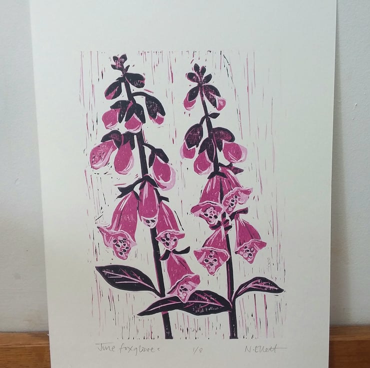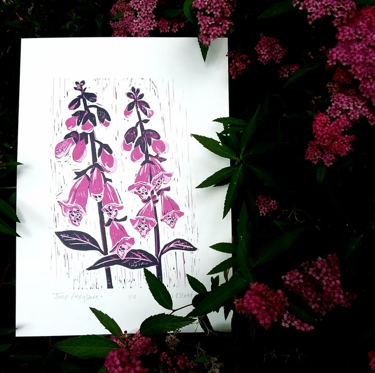 'June foxgloves' - a reduction linoprint in pinks on white.