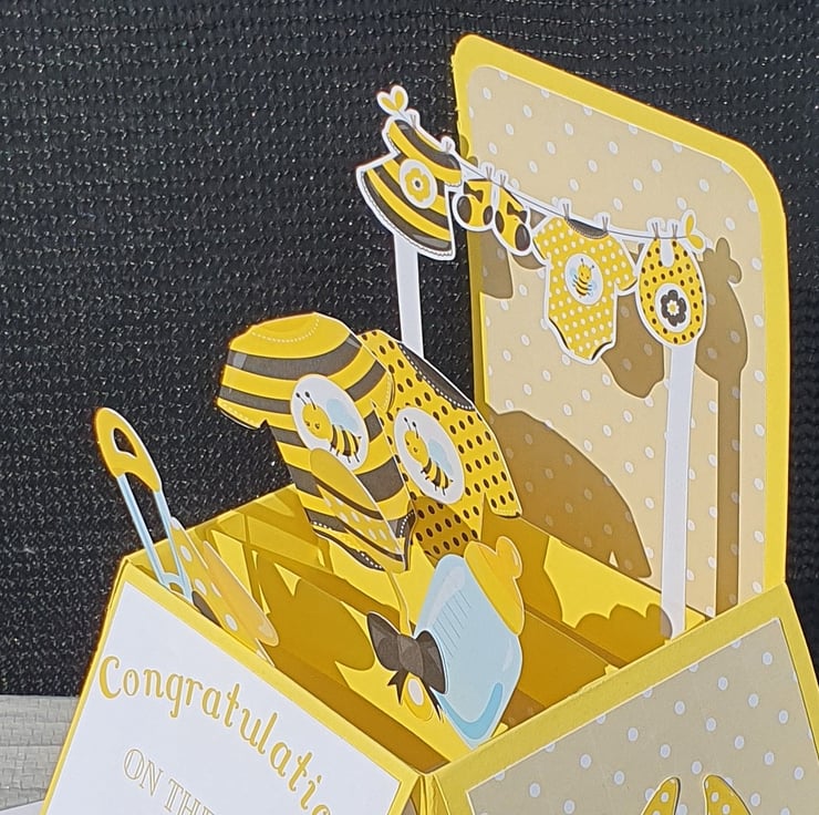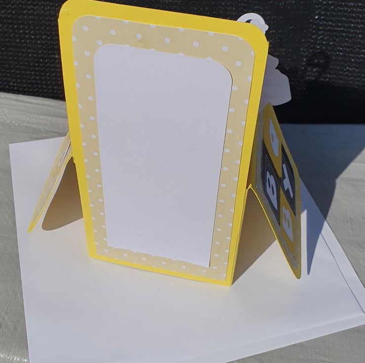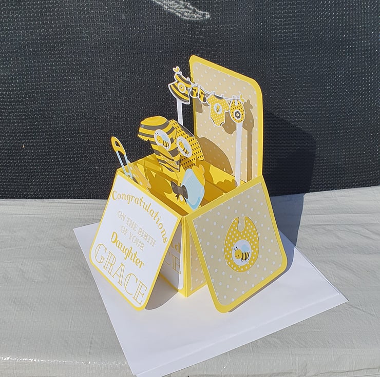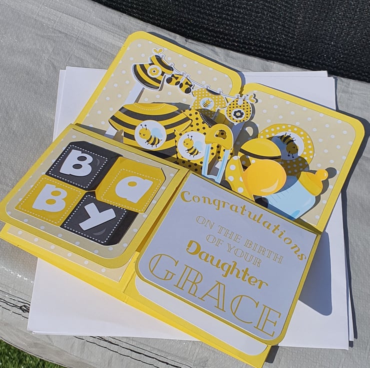 This Large New Baby Card is 20cm x 20cm when laid flat and fits in the envelope provided for easy posting. The yellow base card is decorated with yellow patterned paper and baby themed images. The front panel can be personalised to your choice of message perhaps quoting new baby's name, birth weight and date of birth.