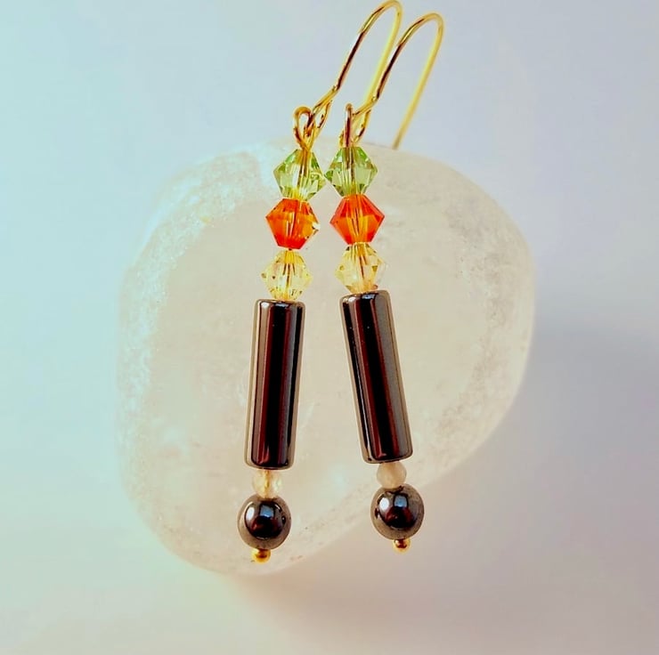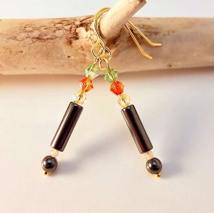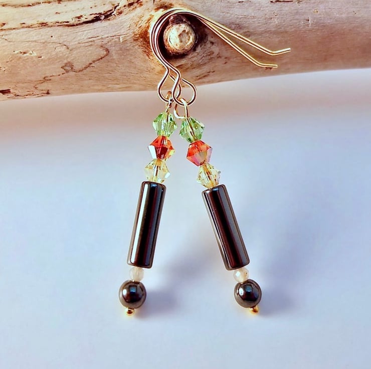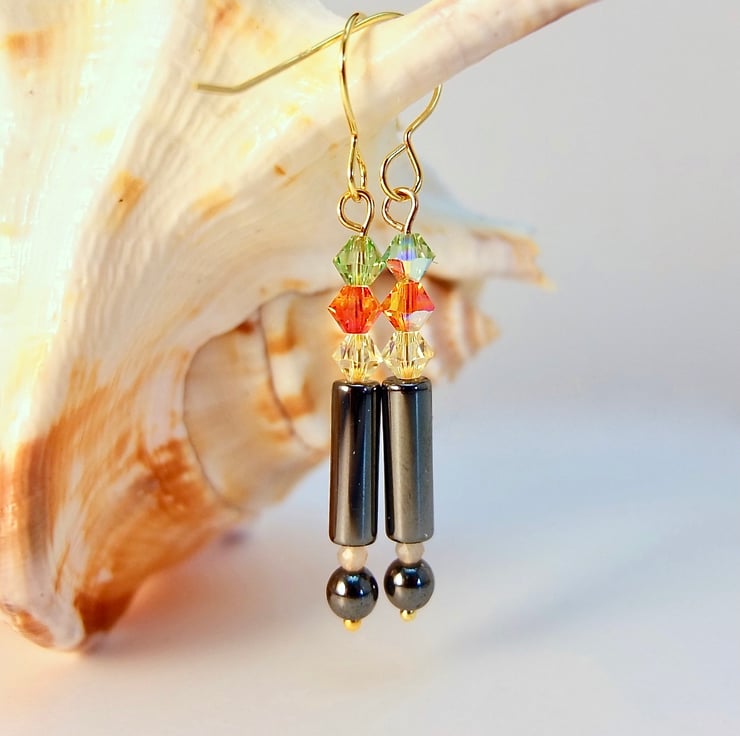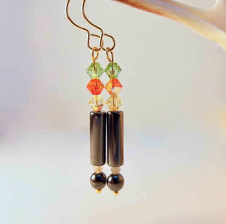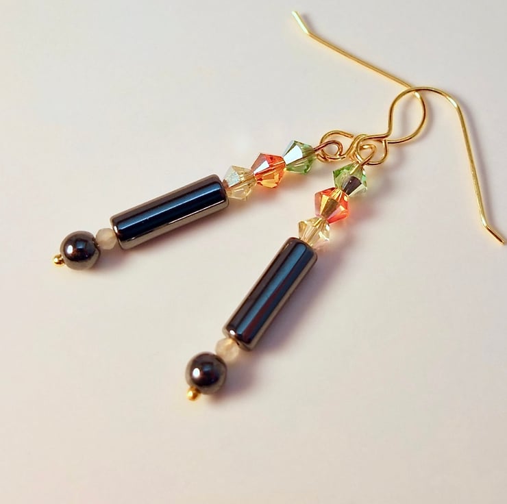 A 4mm Hematite round and 4x13mm tube are separated by a 2mm faceted Tourmaline bead and topped with a sparkling trio of Swarovski crystal bicones in the colours 'jonquil', 'fire opal' and 'peridot'.