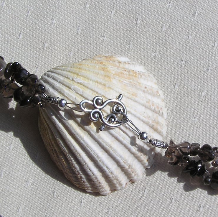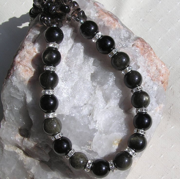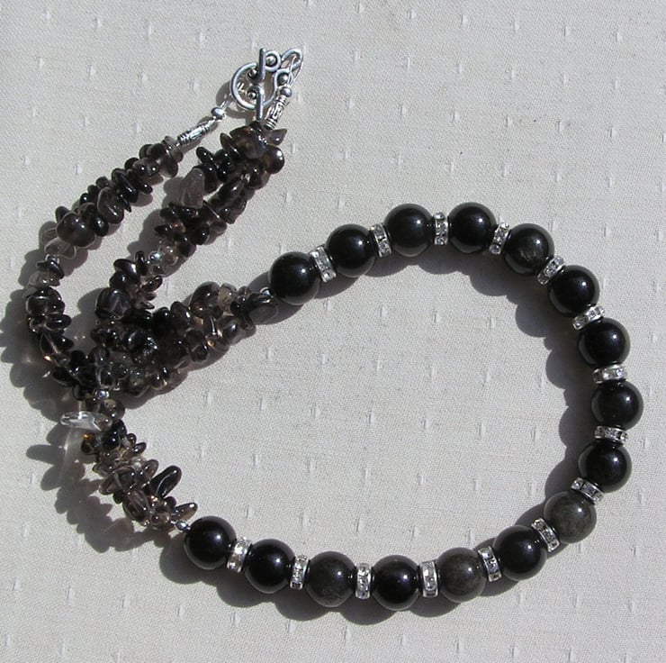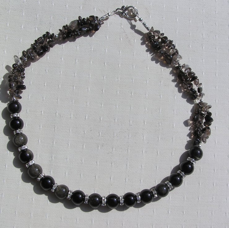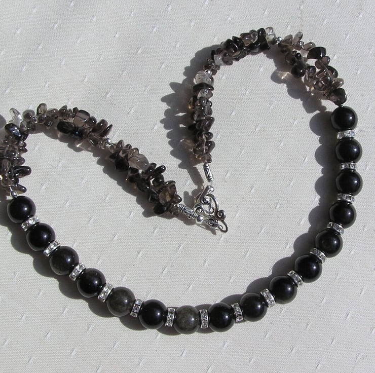 The Central Swathe of this Gorgeous Crystal Gemstone Necklace is made from Chunky Golden Sheen Obsidian large round beads each separated by a Glistening Crystal studded spacer which then flow into double-stranded Smoky Quartz Gem-chips - a rich warming combination that will look stunning either worn casually or with something more Elegant for a Special Evening out