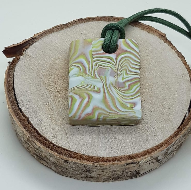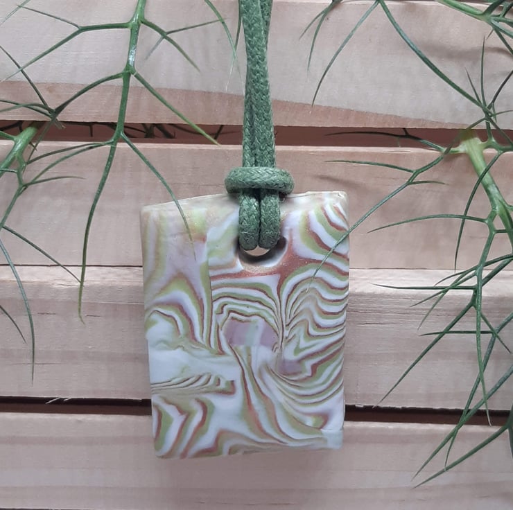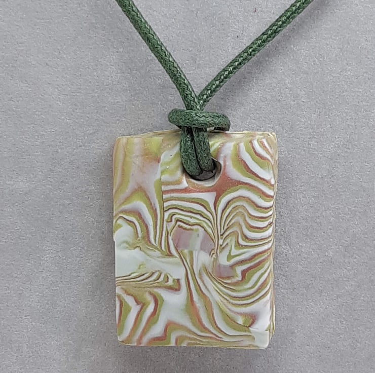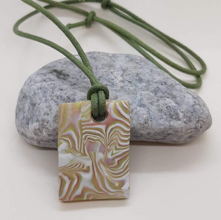 A handmade rectangular shape pendant made from a blend of white, sienna, sage and grey polymer clay to create a in a unique pastel swirl design.