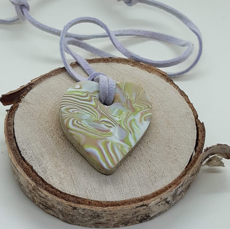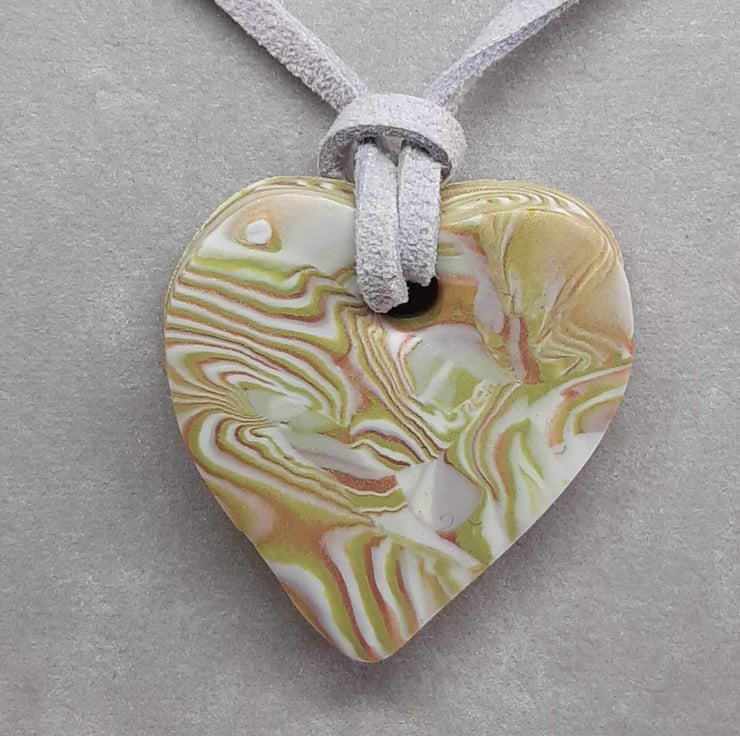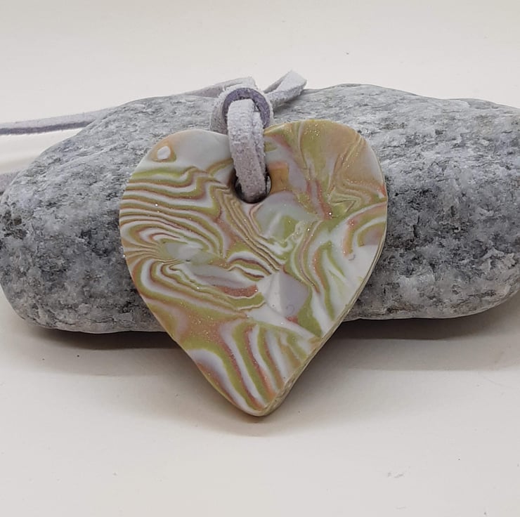 A heart shaped pendant made from a blend of white, sienna, sage and grey polymer clay to create a unique pastel swirl design measuring 39.8mm x 36.3mm across. The back is patterned in a similar way and could be worn with either side.