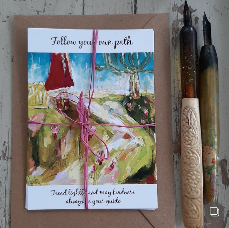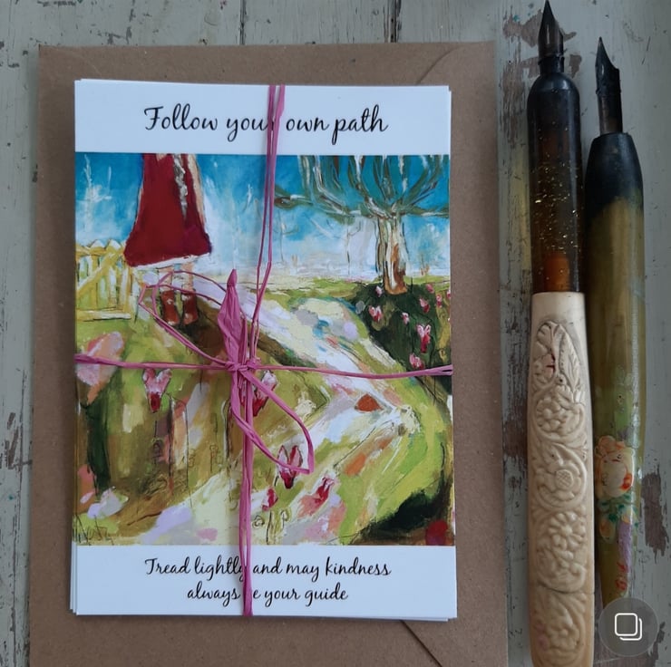Three beautiful postcards, one design, tied in pink raffea they will come in an envelope. 'Follow your own path ' by hesta aka bodkincreates free uk postage x keep spreading kindness x love bodkin