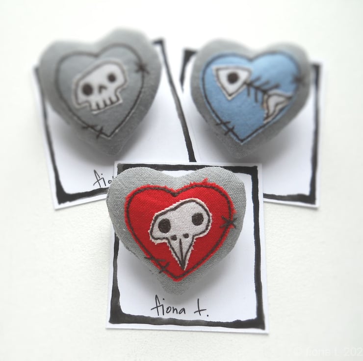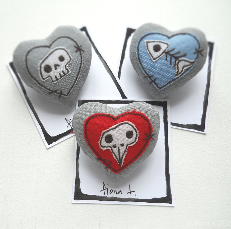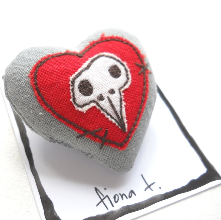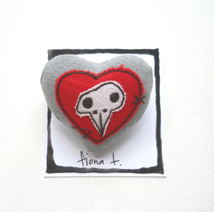 squishy chicken skull heart fabric brooch or pin, measuring about 4cm.