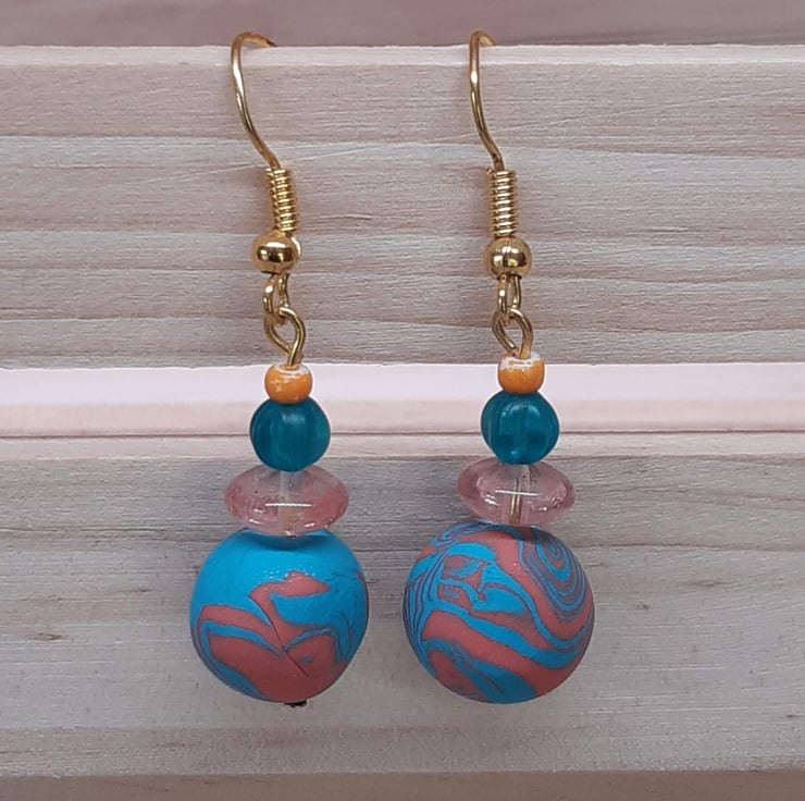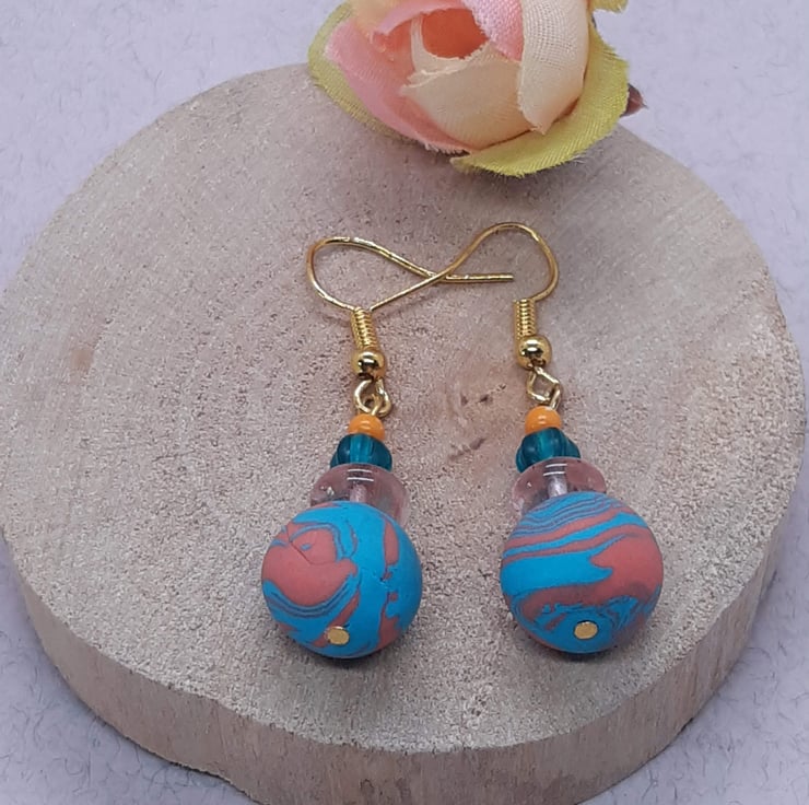 Colourful handmade earrings featuring turquoise and orange polymer clay in a unique swirl design.