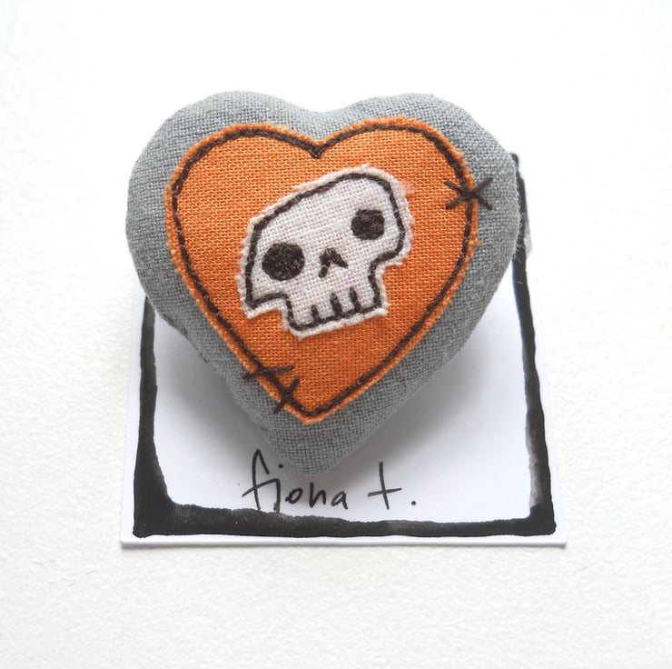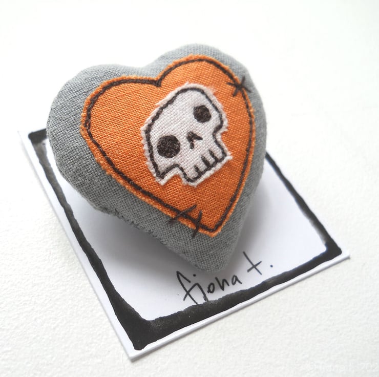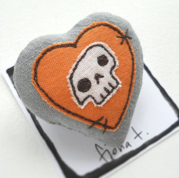 squishy skull heart fabric brooch or pin, measuring about 4cm.