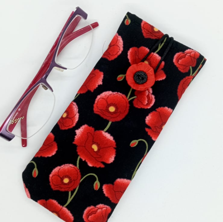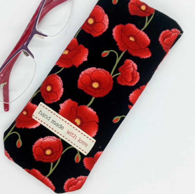 It is wadded to protect your glasses and features a hand made with love label on the back. The lining is in black cotton and It has a fabulous Poppy button and a loop closure to keep your glasses secure.