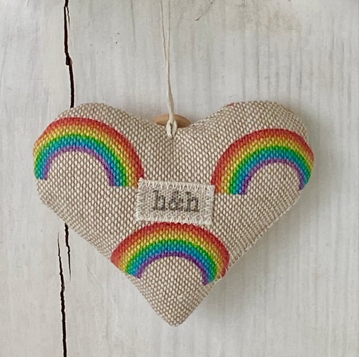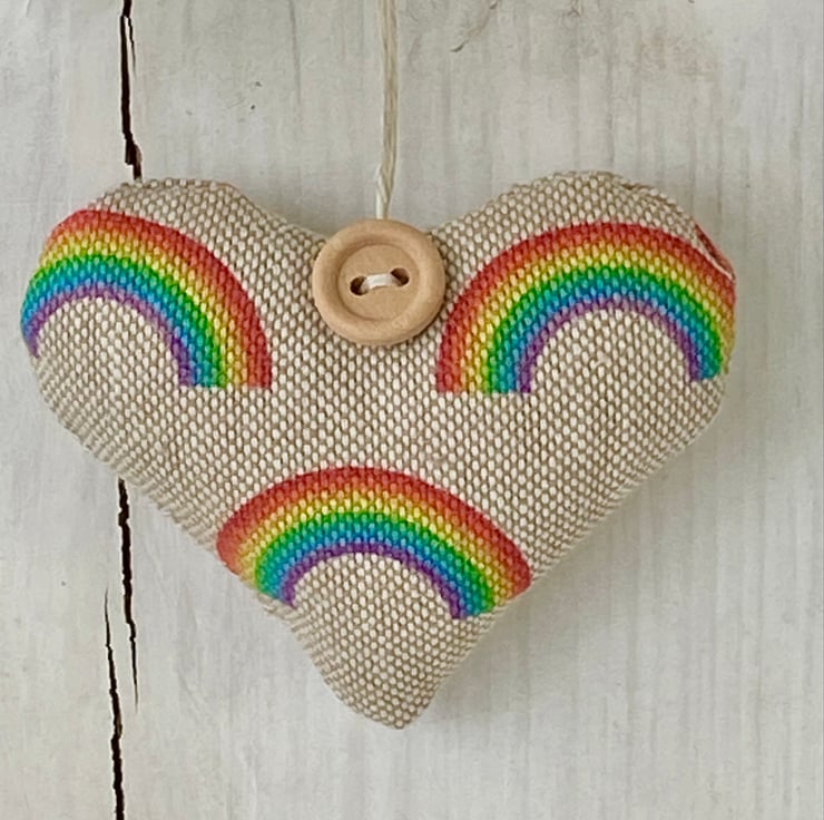 Colourful rainbows on a taupe background feature back and front on this decorative hanging heart. Filled with super fragrant Hampshire lavender, finished with a rustic wooden button and natural hemp twine hanging ties.