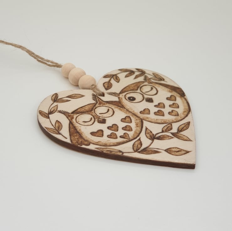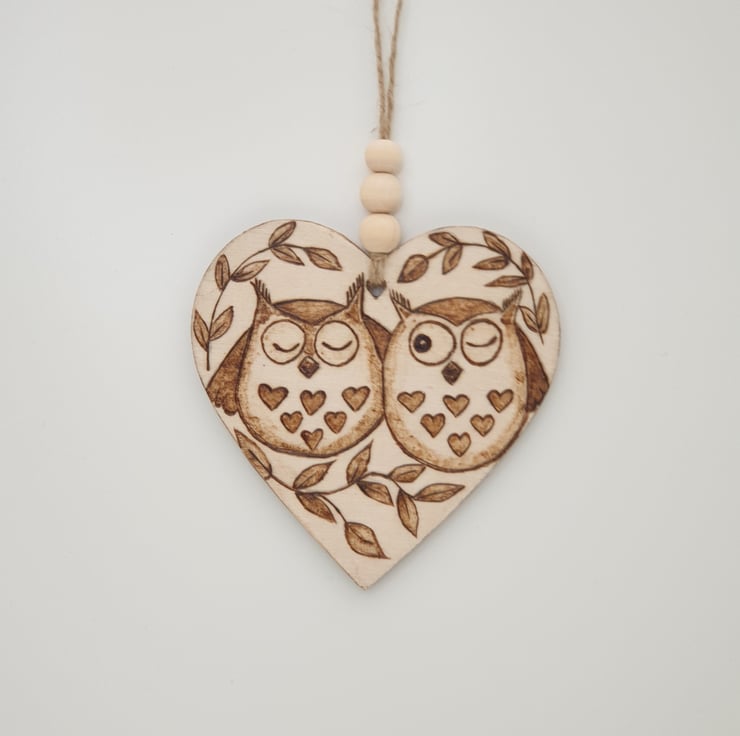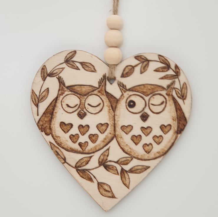 Lovely wooden heart hanging decoration which has been handburnt by me, using pyrography, with a pair of cute owls having a snuggle in a tree. The heart has been given several coats of satin varnish for protection. This adorable heart comes ready to hang with twine and is finished with 3 wooden beads. These cute owls would look great hanging in a window, from a door handle/cupboard knob, bottle, gift bag, etc.