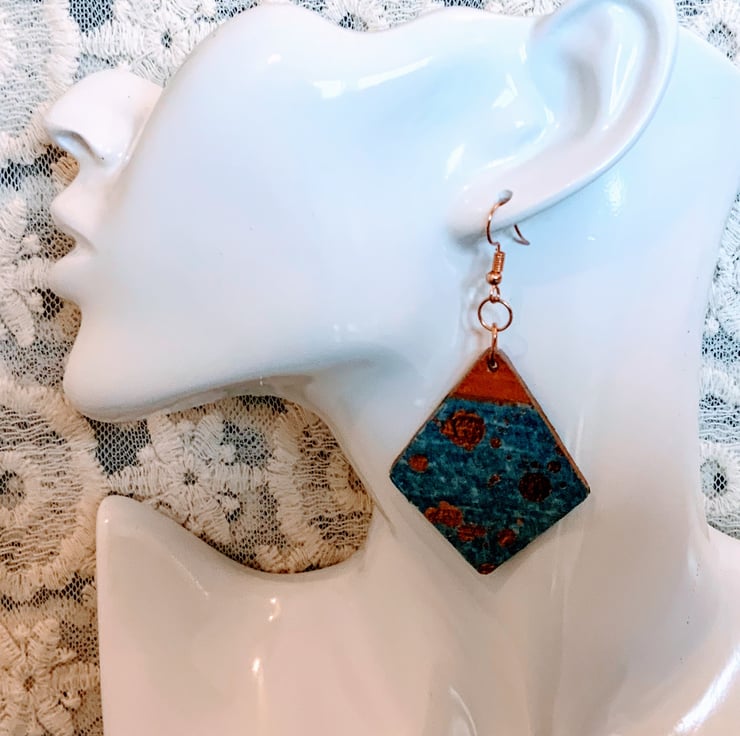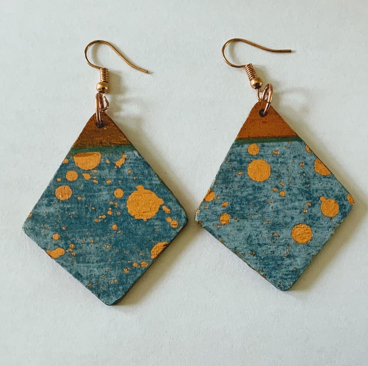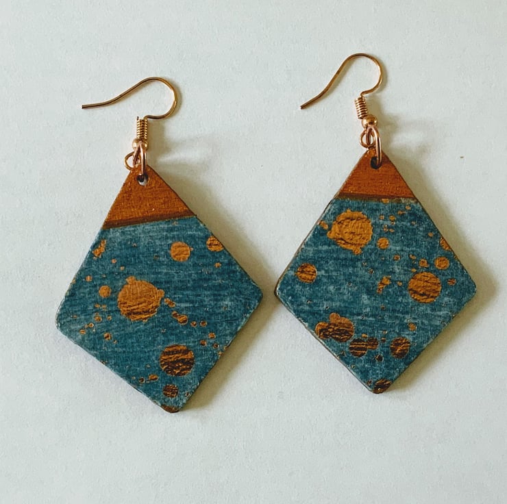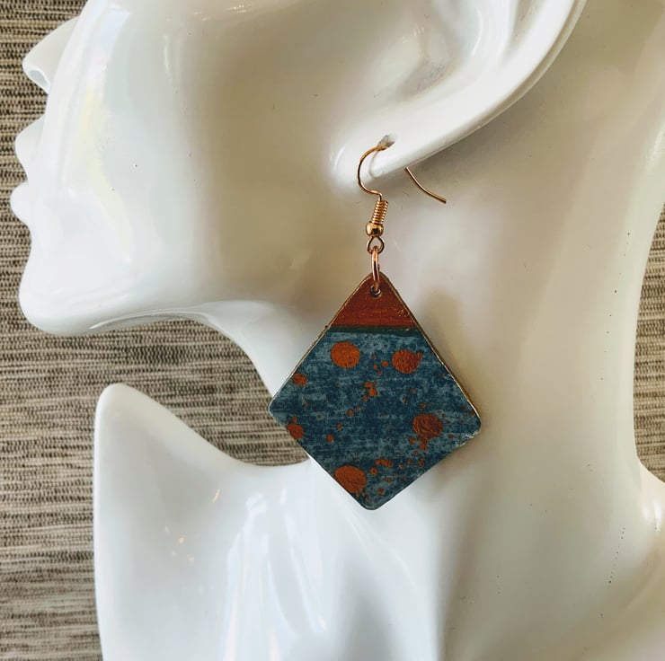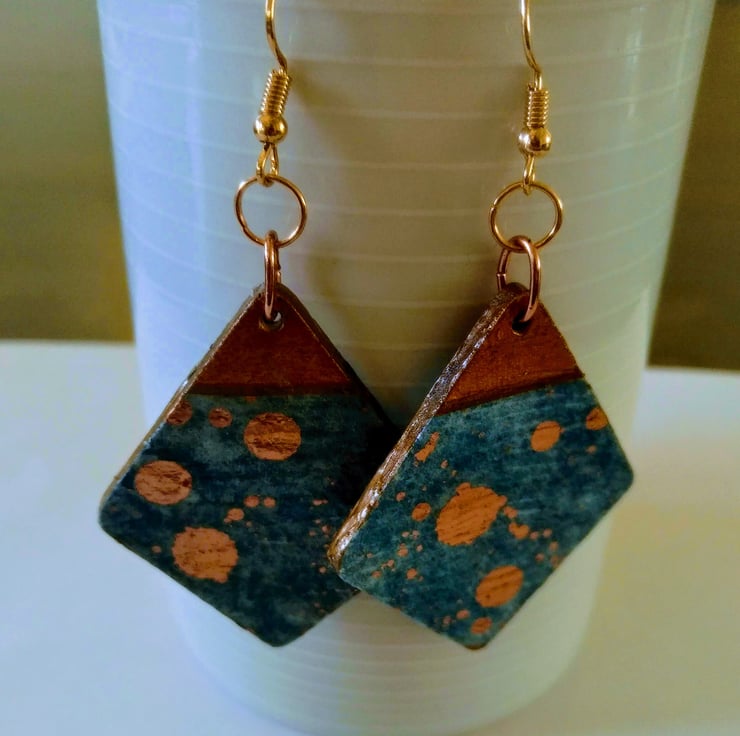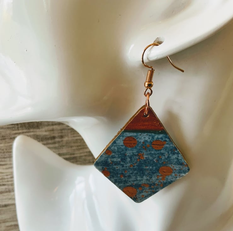 Contemporary geometric wood earrings, Decoupaged and hand painted with a rose gold dot splash design with hints of copper on a denim blue background. Hints of shimmer and sparkle within the pattern will reflect in the light. Capturing that rustic distressed charm on rose gold ear wires. Very light weight.