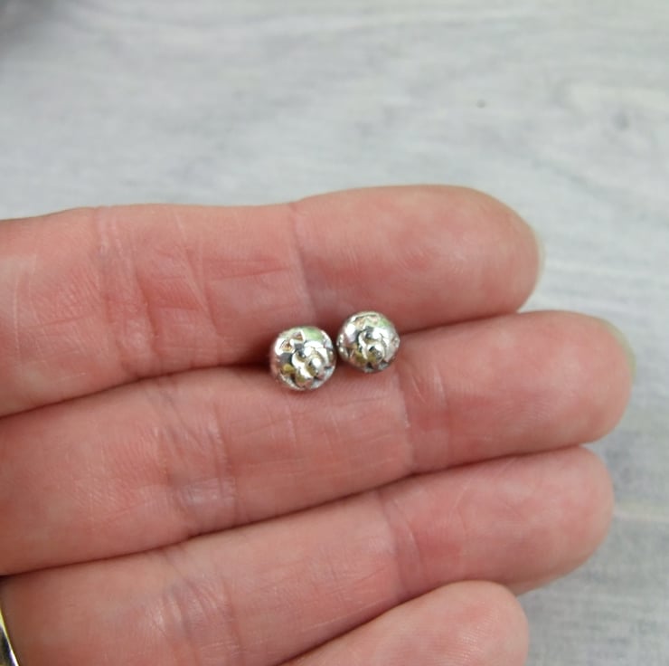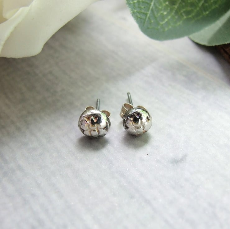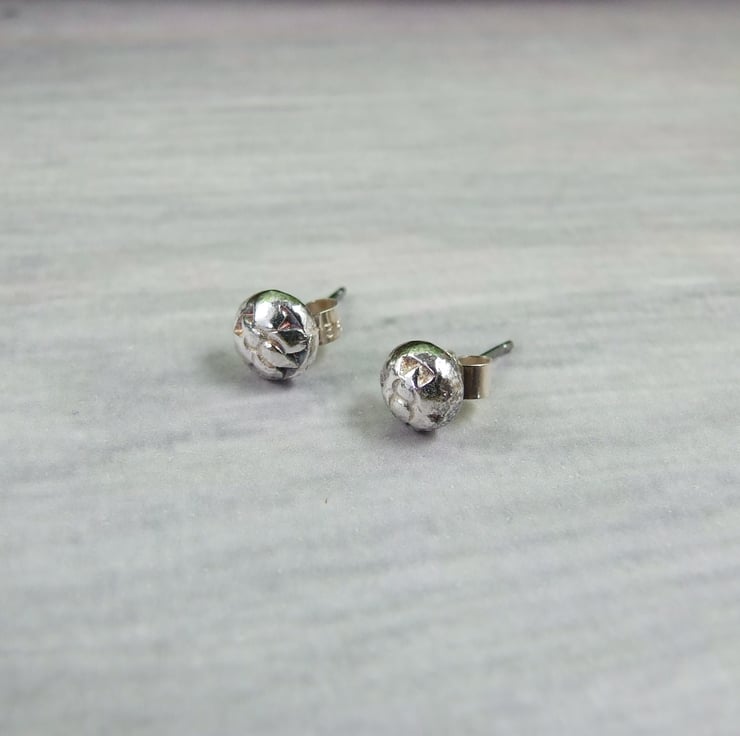 The little studs have been created from recycled sterling silver, heated to melting point to form a nugget then hammered into a steel texture plate to create the little butterfly design. Soldered to regular .925 sterling silver ear posts with butterfly backs.