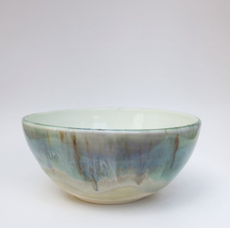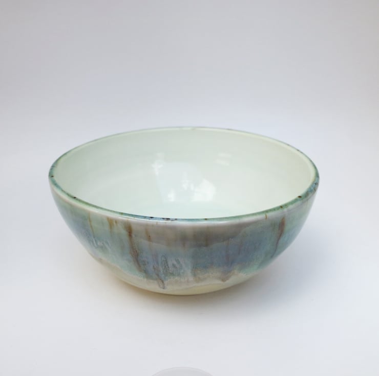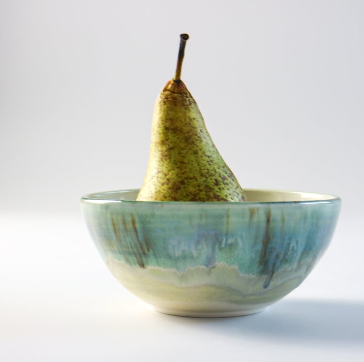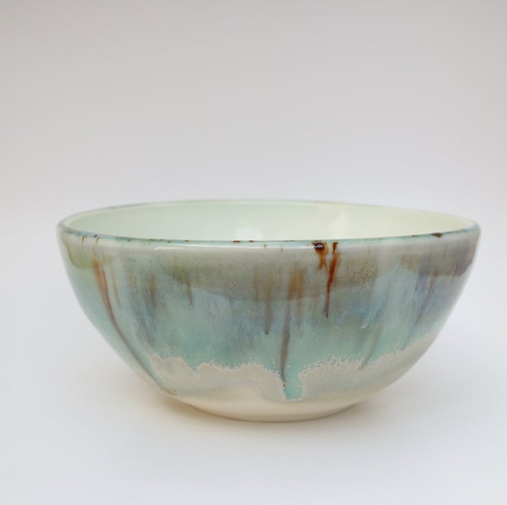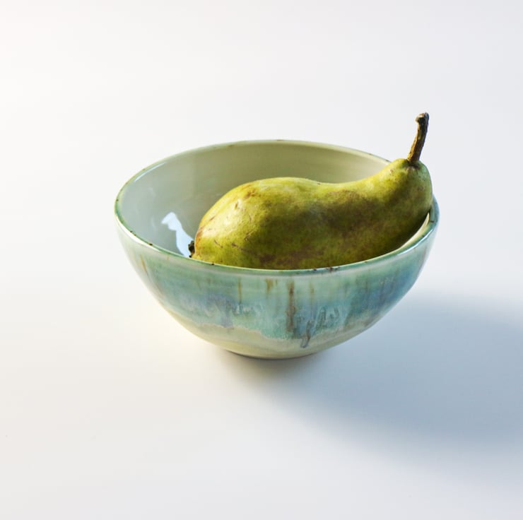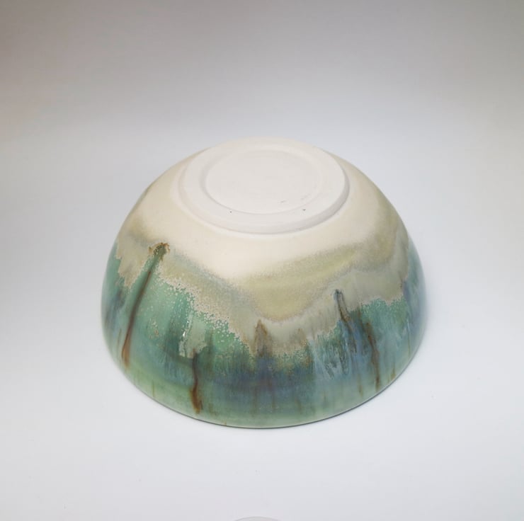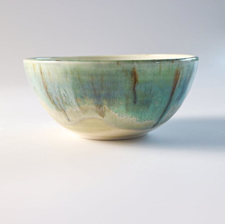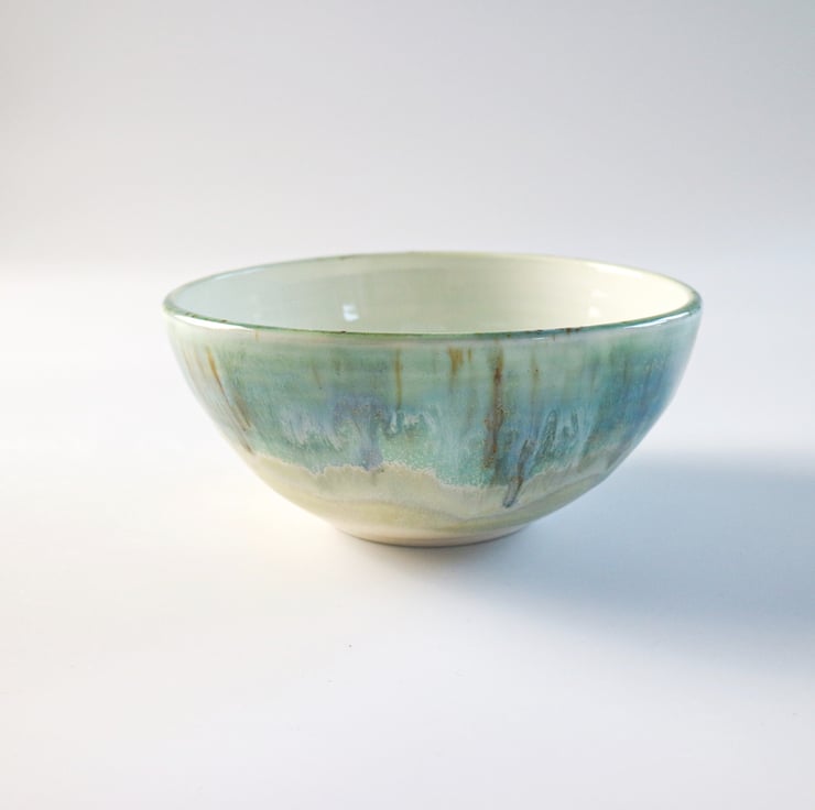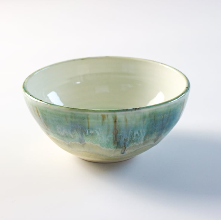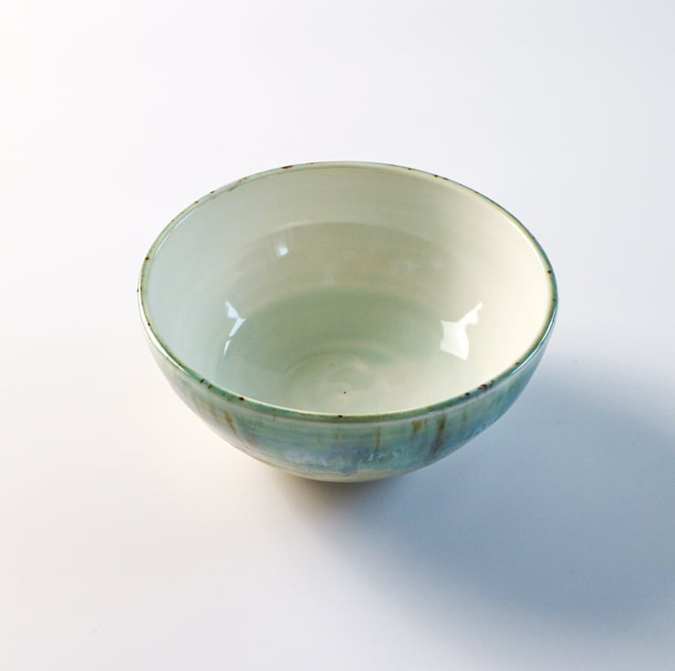 The inside of the bowl is a glossy pale aqua and outside has a interesting green-blue glaze.