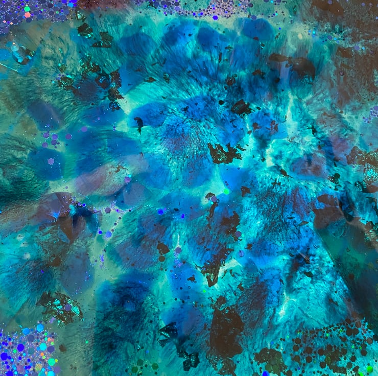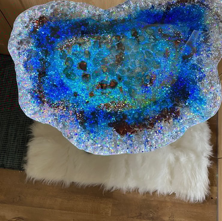 2 cm deep resin with ink, crystals, glitter, glow pigments.