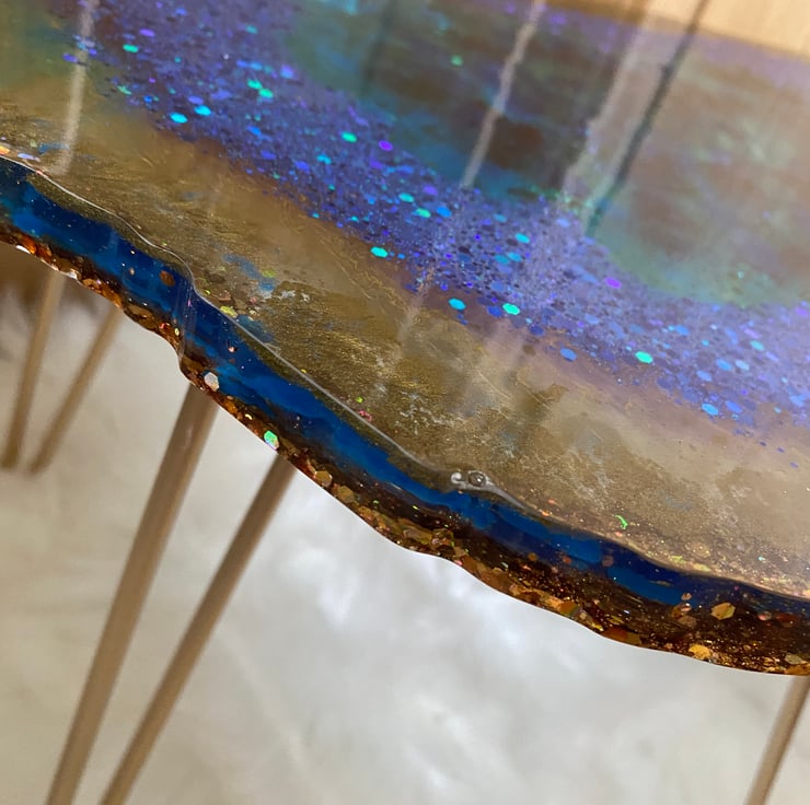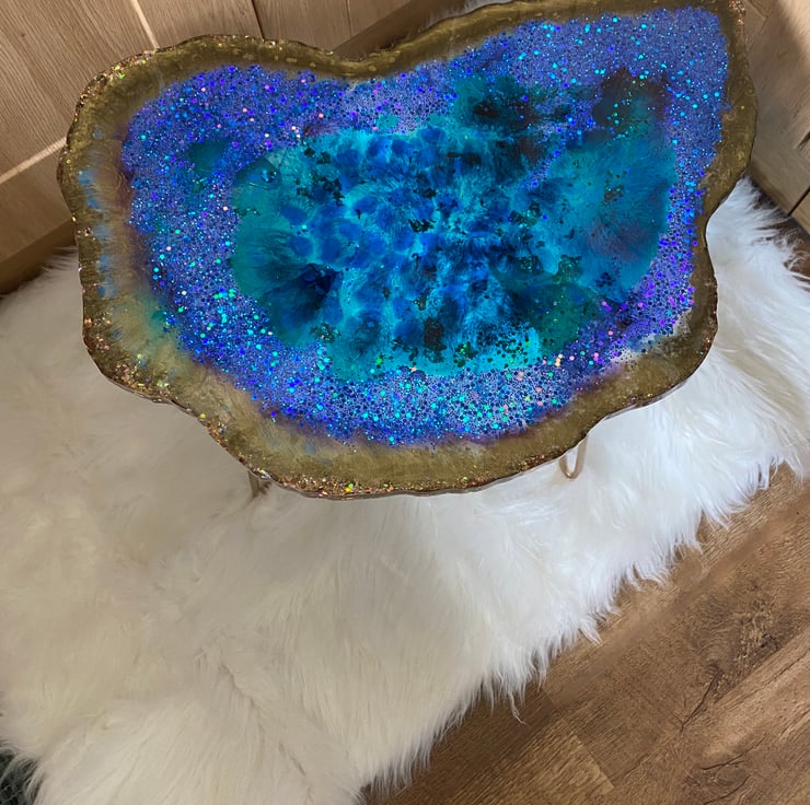 Resin geode table, unique with multi media, stunning in any room; gold hairpin legs, lovely and sturdy.