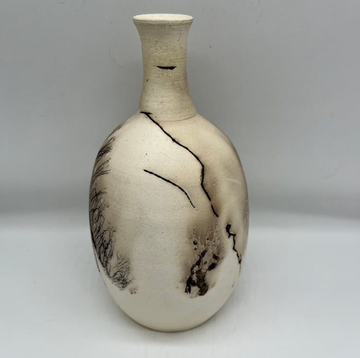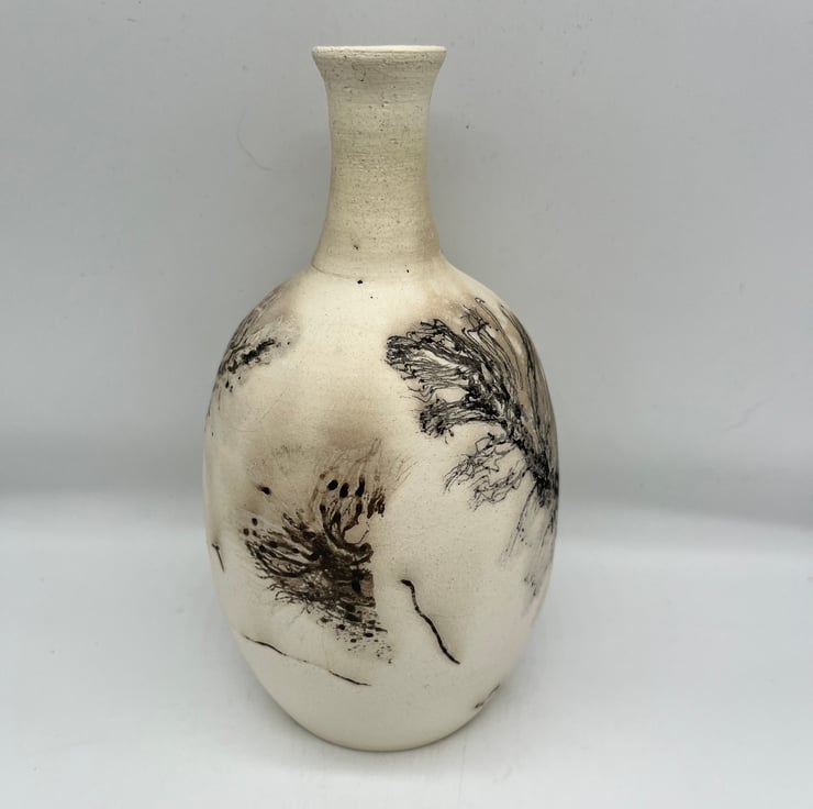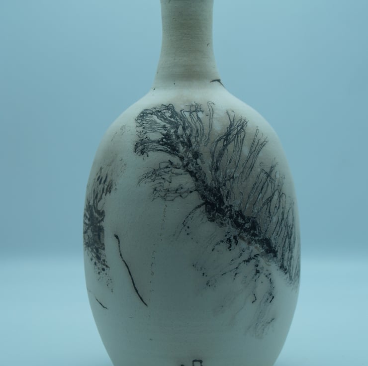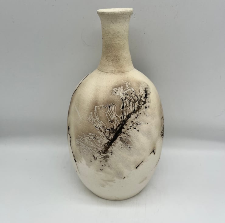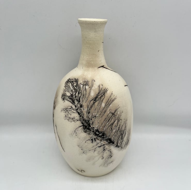 This is a horsehair and feather Raku pot made using Ashraf Hanna clay to give it a beautiful white colour. Raku is a traditional Japanese style of pottery whereby the pot is fired to bisque temperatures in an electric kiln and then a secondary firing takes place in a gas kiln. When the pot reaches temperature it is removed from the kiln and the feather and horsehair details are applied by hand by burning the organic material into the clay. Because of the low firing temperatures of Raku they are NOT food safe and will NOT hold water so are purely decorative