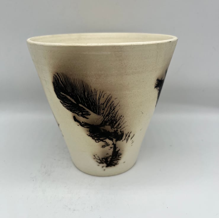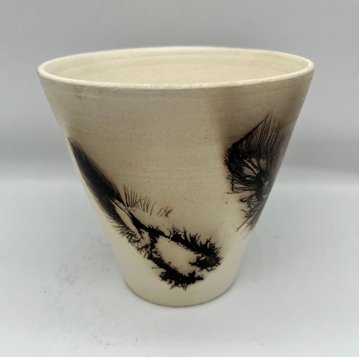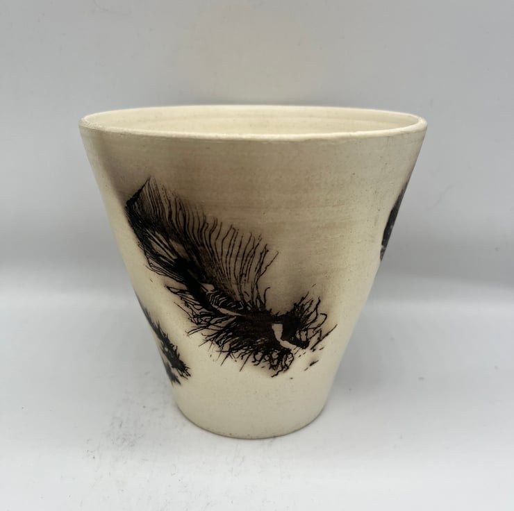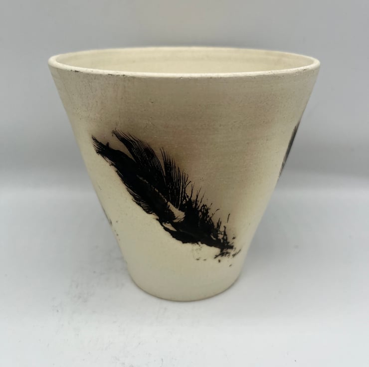 This is a horsehair and feather Raku pot made using Ashraf Hanna clay to give it a beautiful white colour. Raku is a traditional Japanese style of pottery whereby the pot is fired to bisque temperatures in an electric kiln and then a secondary firing takes place in a gas kiln. When the pot reaches temperature it is removed from the kiln and the feather and horsehair details are applied by hand by burning the organic material into the clay. Because of the low firing temperatures of Raku they are NOT food safe and will NOT hold water so are purely decorative