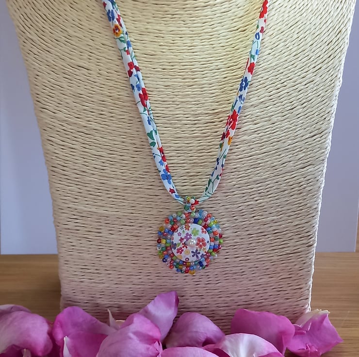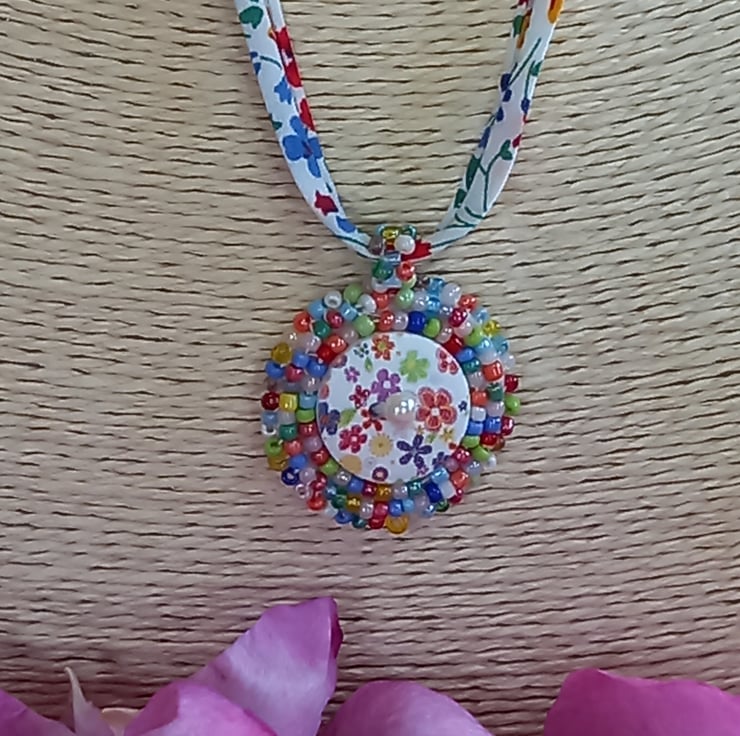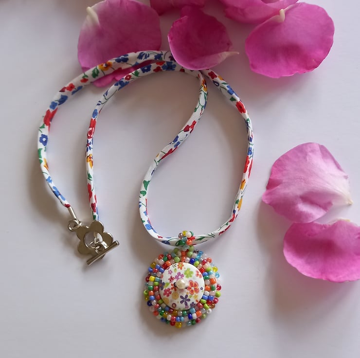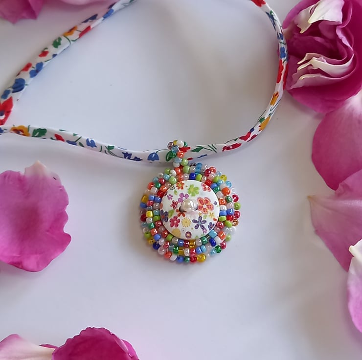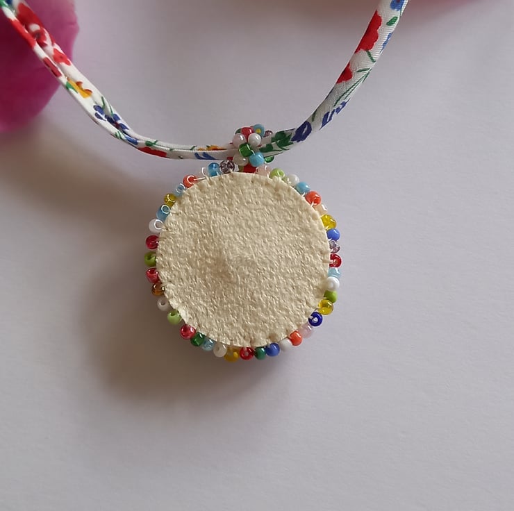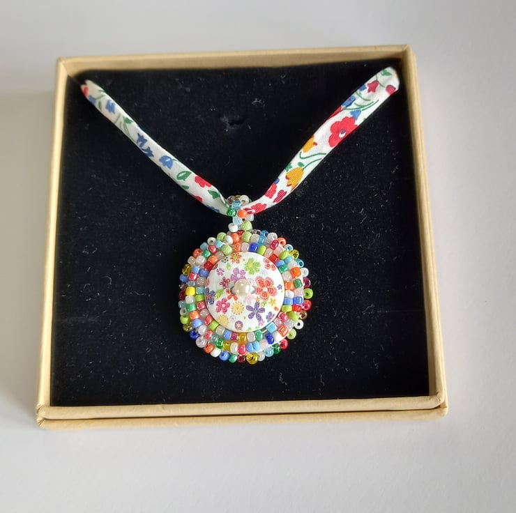 This bead embroidered pendant just oozes summer, flowers and fun! At its heart is a floral wooden button, decorated with a glass pearl in the centre and surrounded by bead embroidered and multi coloured seed beads. It's backed with cream ultrasuede and has a beaded bail. Liberty cotton cord helps to complete this pretty pendant, which fastens neatly with a flower shaped toggle clasp.
