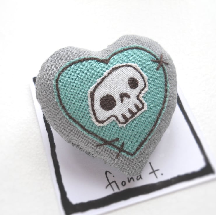 squishy skull heart fabric brooch or pin, measuring about 4cm.