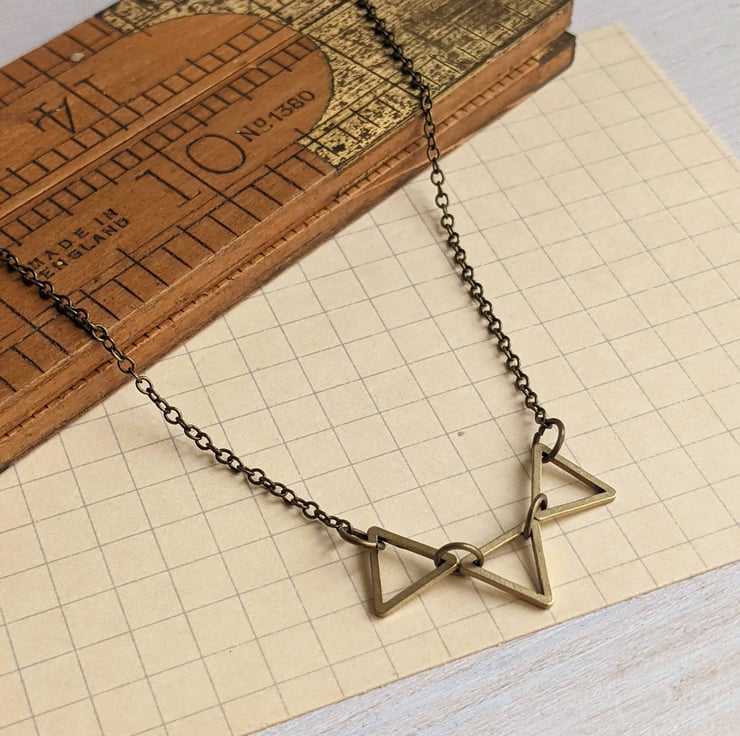 Each little triangle measures 1/4" and is raw golden brass. Total necklace length is 18" using fine bronze trace chain. Nickel free.