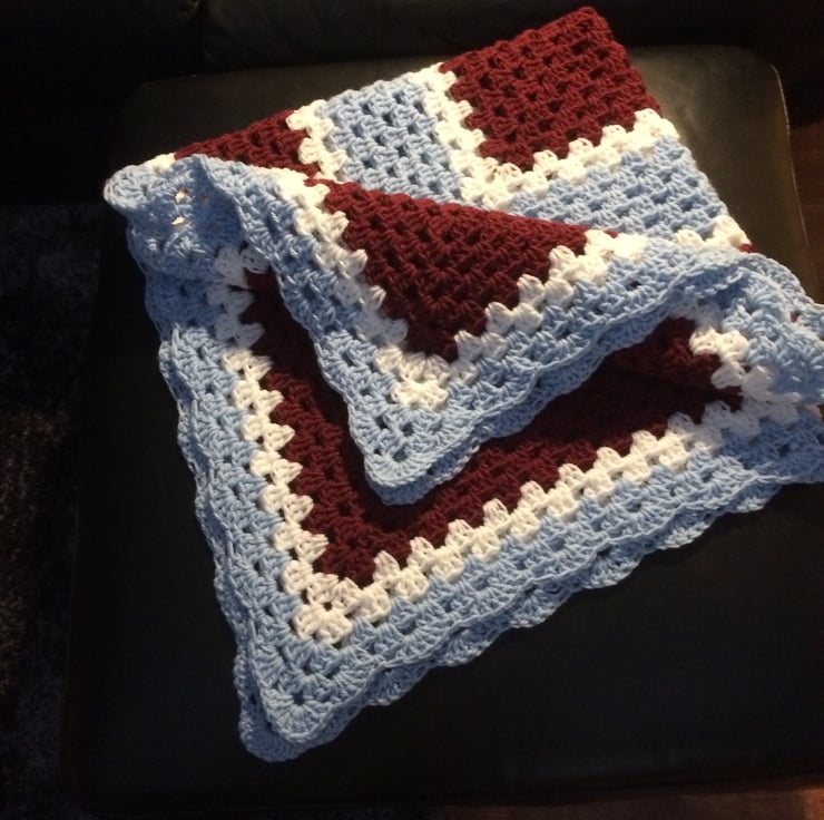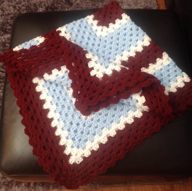 Handmade Bespoke Baby Blanket in West Ham / Aston Villa football Colours ideal for Buggy Pram or Cot even Baby Car Seats made in Pet and Smoke Free Home……Pattern colours will vary but Quality will not (See Photos) …..great for Baby Shower Gift……MADE TO ORDER ..approximately 43 inches square
