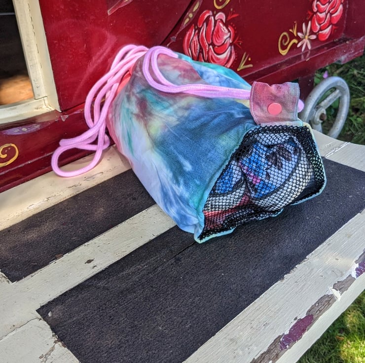 The netted bottom helps sand and water fall through and the water proof PUL lining keeps the cotton outer dry.