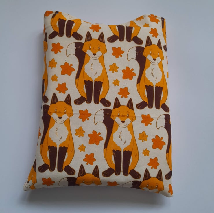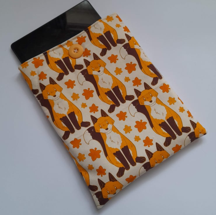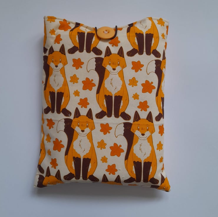 The sleeve is made out of a fox design cotton fabric on the outside and a cream cotton fabric on the inside. The sleeve is padded for extra protection for your book and a button with elastic is used to close your sleeve