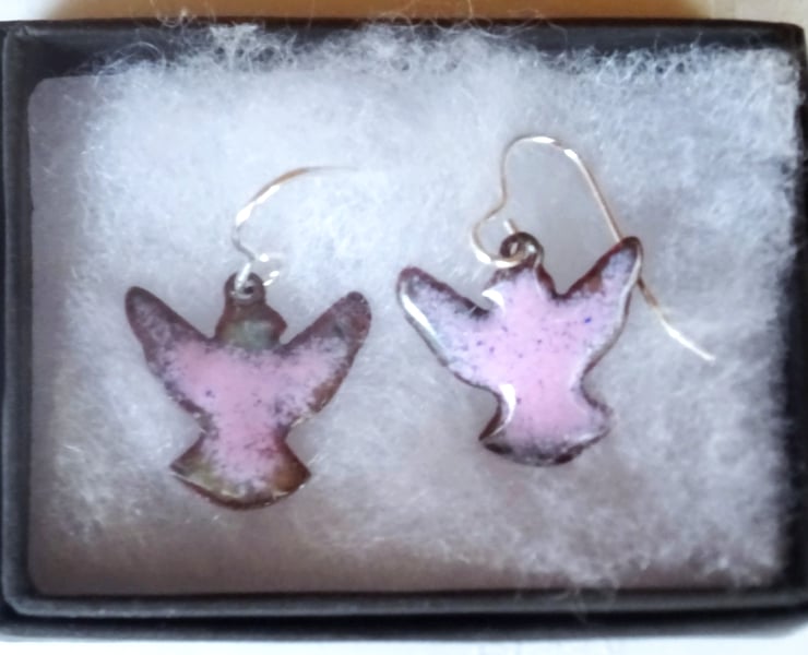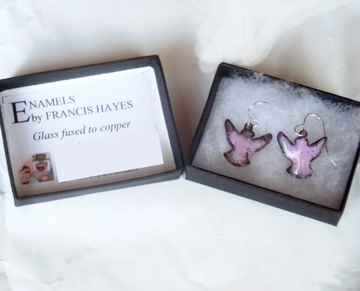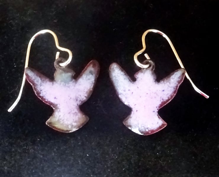 I have made these earrings by building up layers of clear enamel on the copper shape and then adding a layer of mauve.