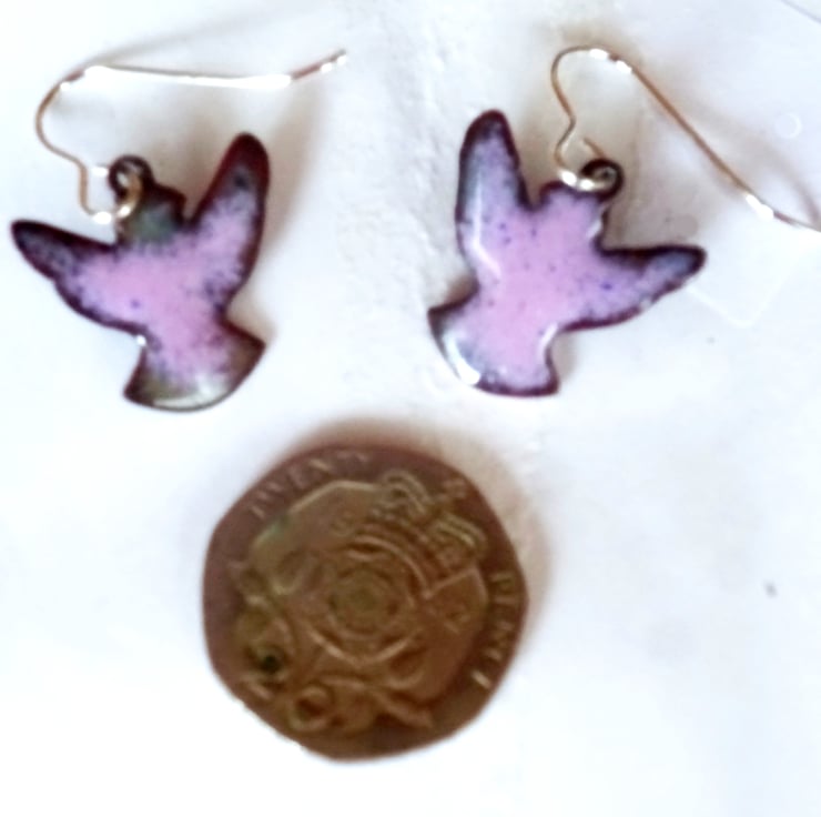 The doves measure 18mm, at their longest (head to tail) and at their widest (wingtip to wingtip). I have mounted them on silver wires.