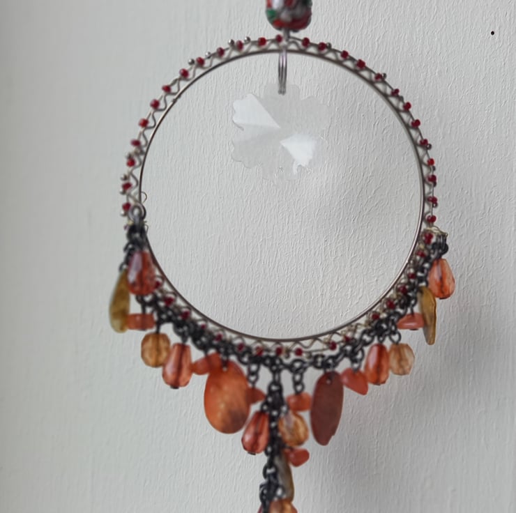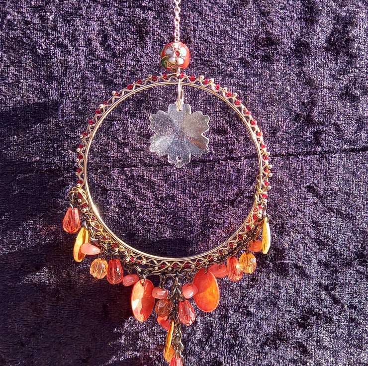 I recycled jewellery and other materials to make this lovely suncatcher length of suncatcher 18cm length of chain 16cm