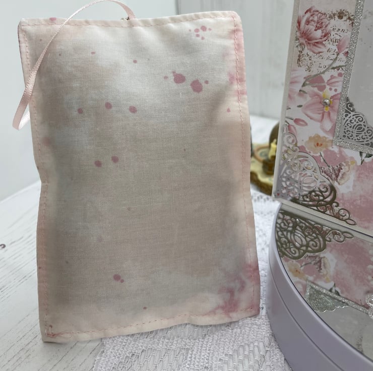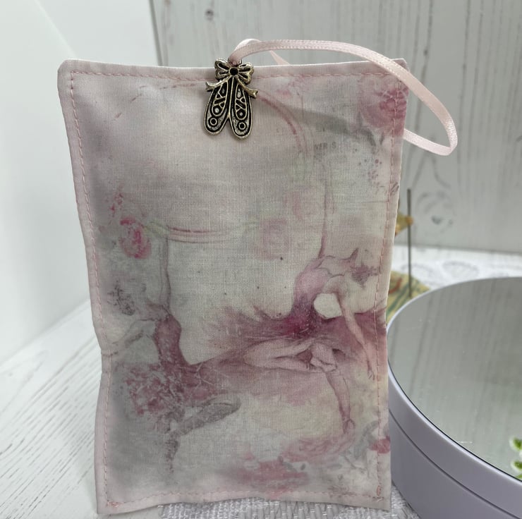 The lavender sachet is printed onto cotton with a mottled pink backing. Pink ribbon and ballet shoe charm. Filled with lavender from Provence.