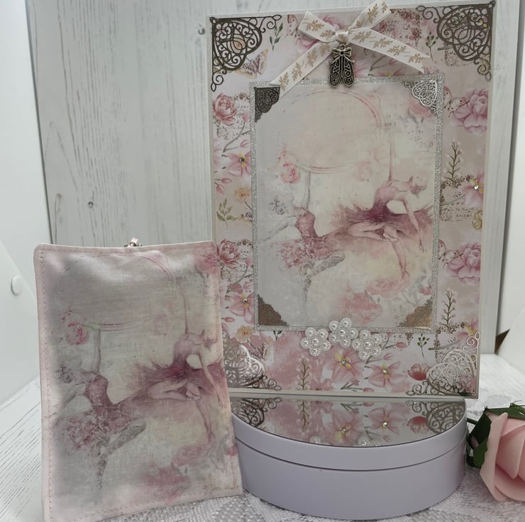 A5 white pearl card. Floral backing paper and a pretty ballet topper on silver glitter card. Embellished with silver corners, diamantés, acrylic flowers, bow and ballet shoe charms.