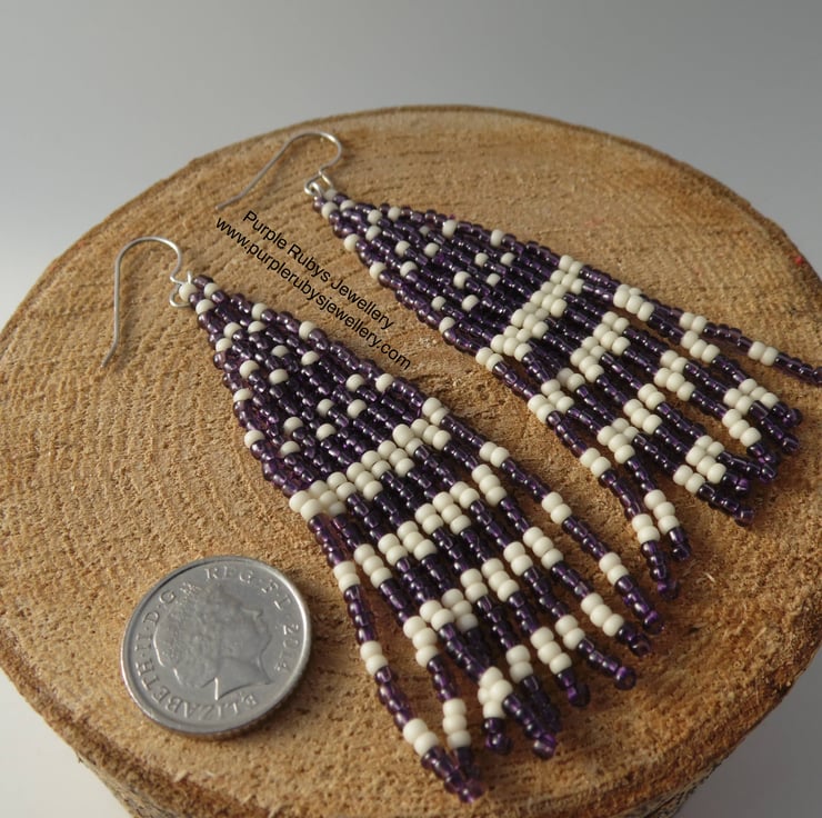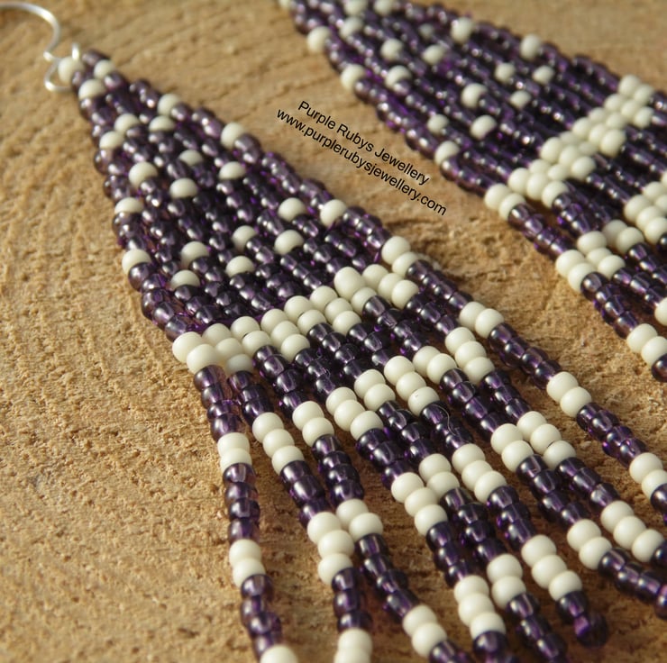 Hand beaded fringe earrings in transparent amethyst & opaque cream; these long statement earrings are lightweight & so swishy!