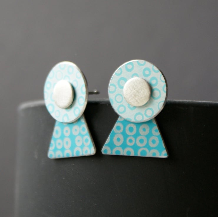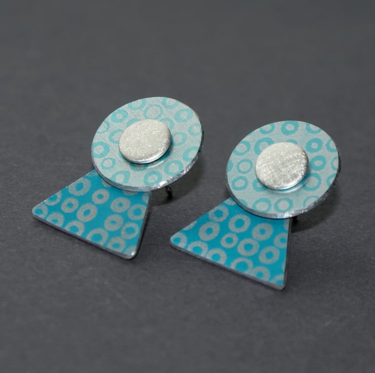 A quirky pair of earrings that can be worn in a number of ways. They are made up of 3 parts, a sterling silver circle stud, a lcoloured triangle and a coloured circle. These are hand crafted from anodised aluminium and are patterned on one side and plain on the other.