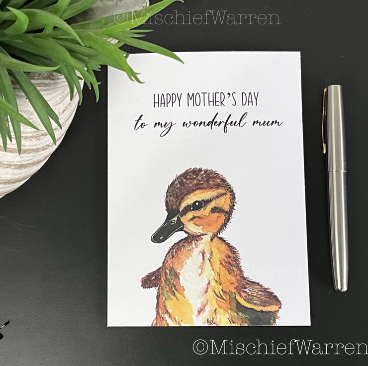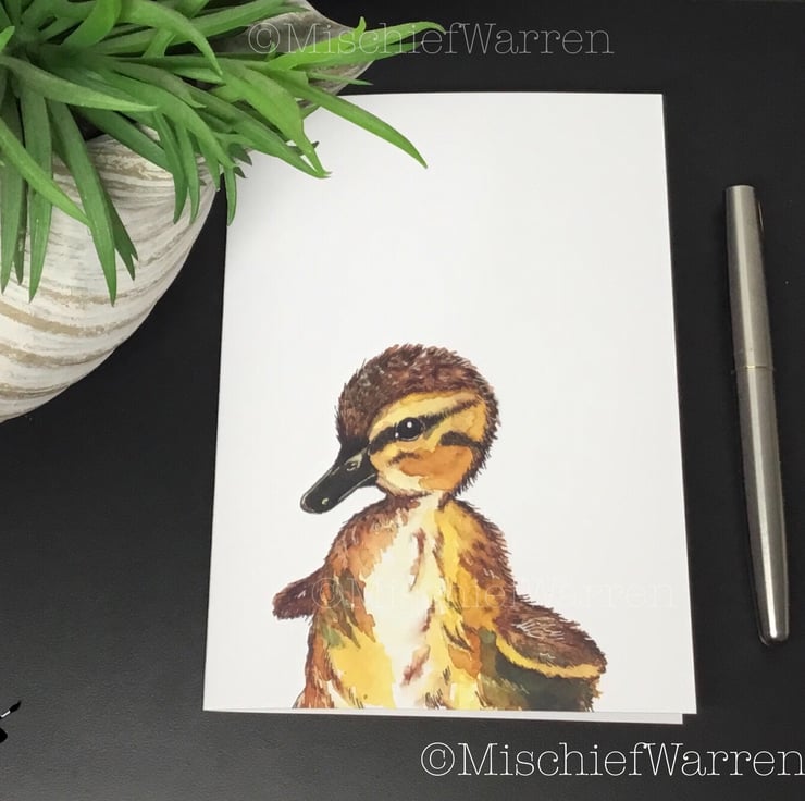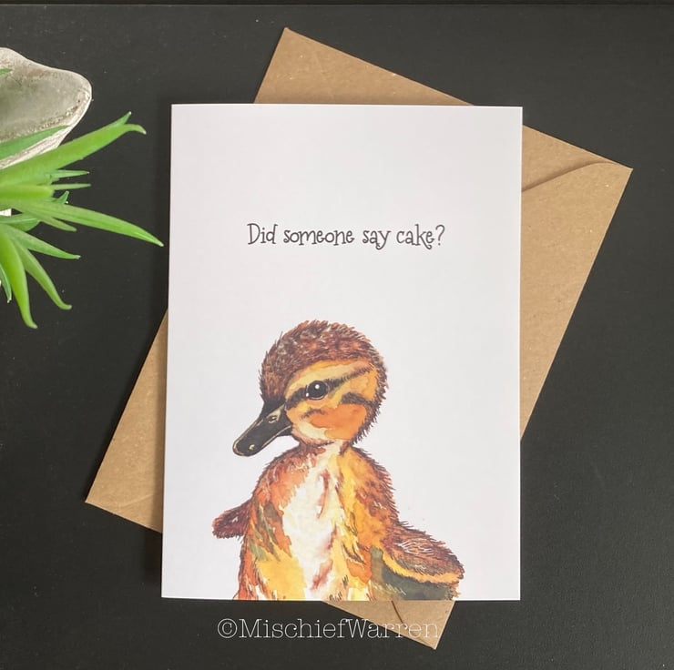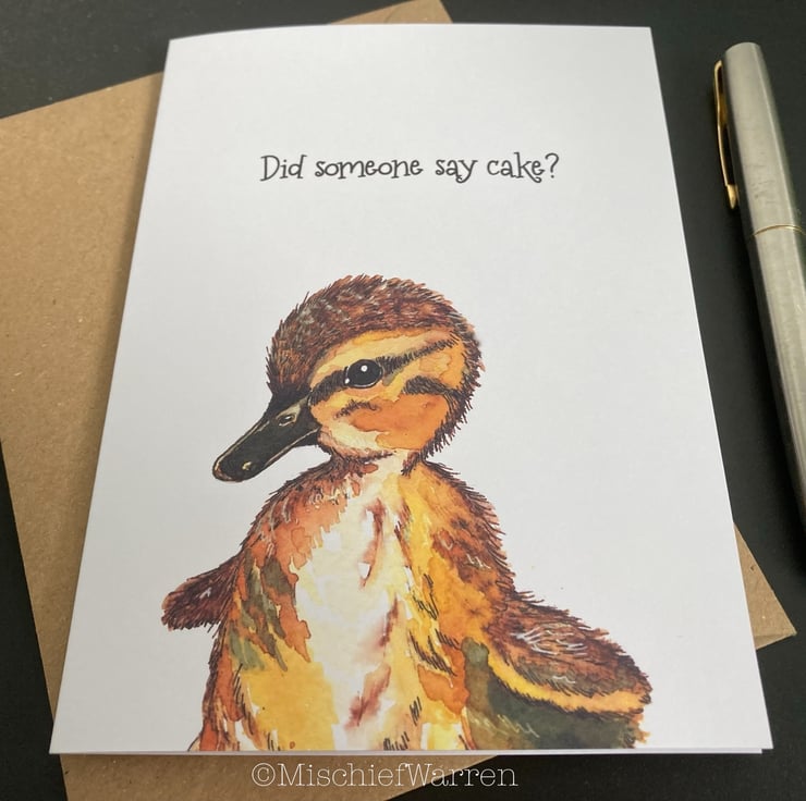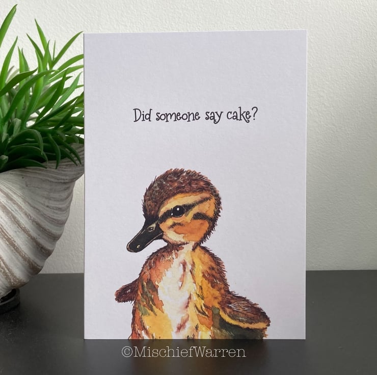 This handmade duck card features a print of my ink and watercolour illustration of a cute duckling. Can be personalised for any occasion; birthday, Easter, Valentine’s day, Mothers Day, Fathers Day, Thank you or Christmas perhaps. I like “Did someone say cake?” Which covers any celebration involving cake including retirement and wedding.