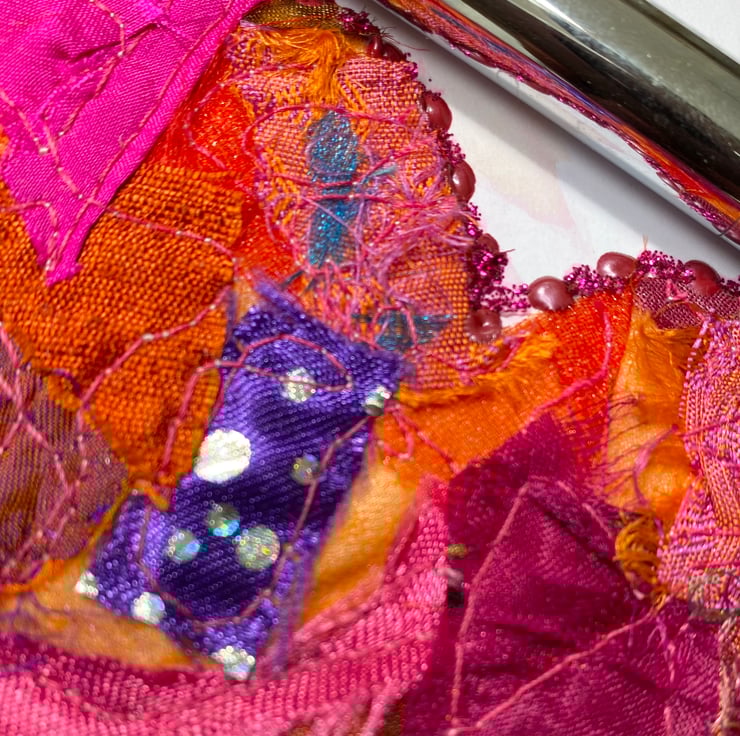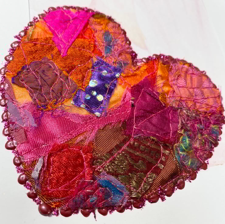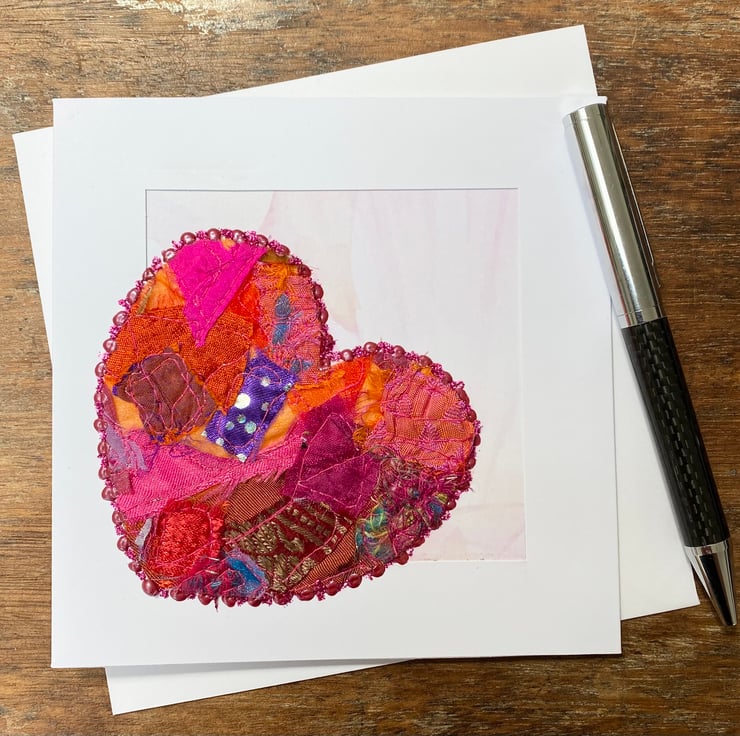 This dramatic embroidered heart has been made with my own handmade up-cycled fabric. Its been made from silk, ribbons, cottons and enhanced with free motion embroidery. It’s framed with 3-D dots. It’s perfect for a wedding, anniversary, engagement, Valentines or for someone very special. It is blank inside making it ideal for any occasion. This White Card measures 14.5 x 14.5cm, comes with an envelop and in a plastic cover for protection.