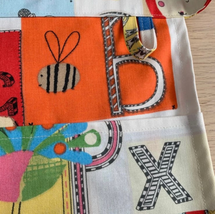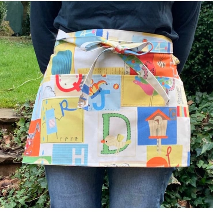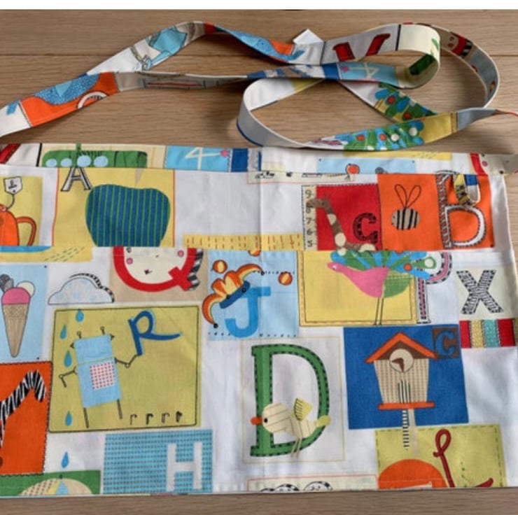 Colourful half apron with two large pockets made from harlequin Little Letters cotton with bright alphabet design.