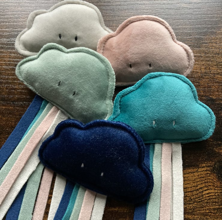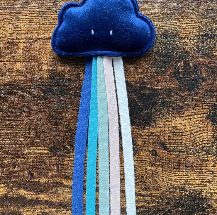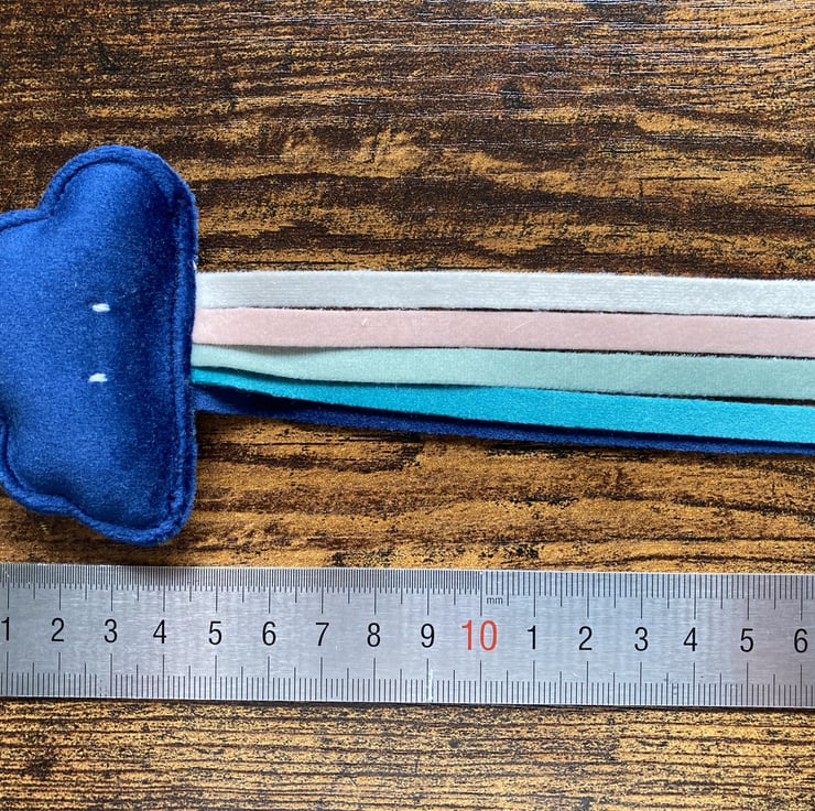 Each cloud is 7cm at it's widest base and 17.5cm in length with the raindrop strips. Topstitched for durability.