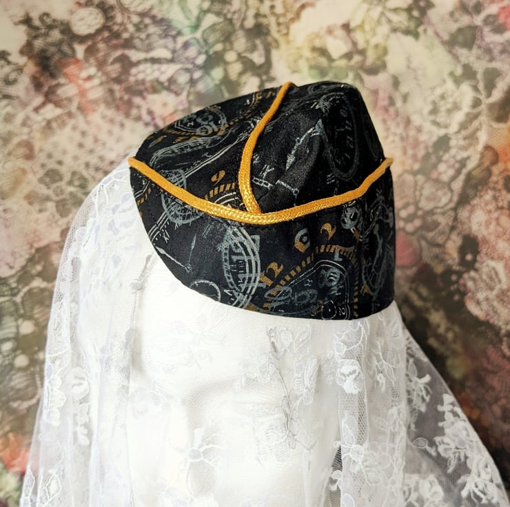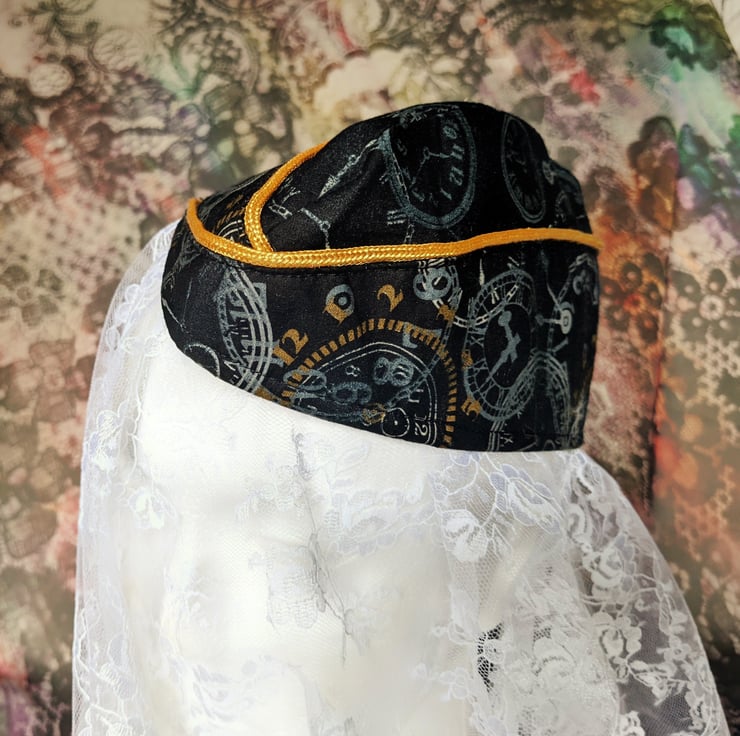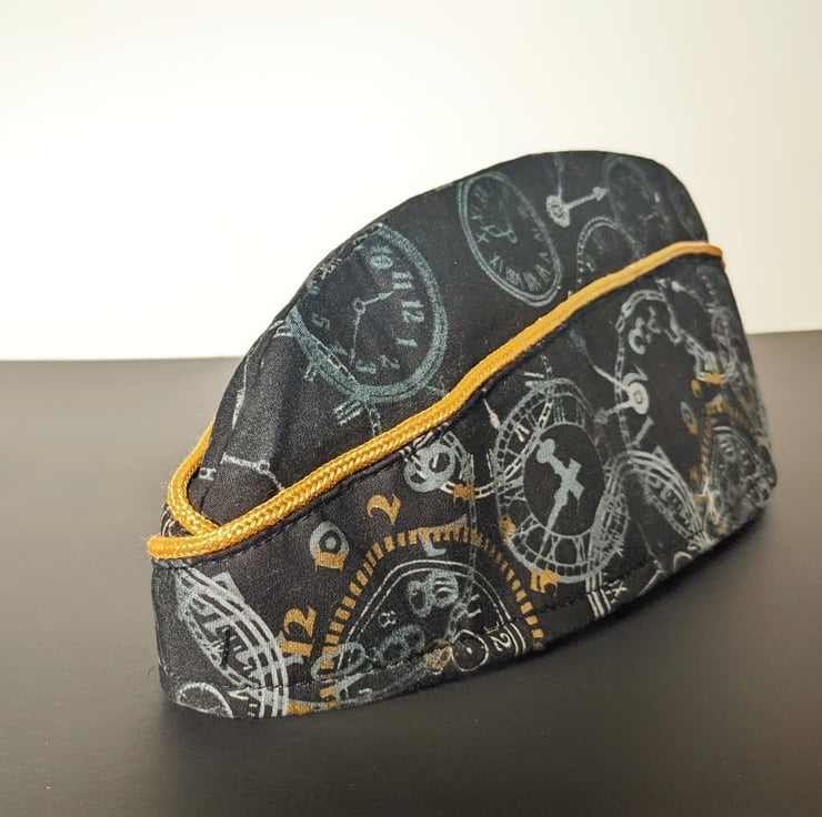 This unique hat is made from 100% cotton fabric with a brass effect and silver clock face print. Finished with complimenting gold effect piping.