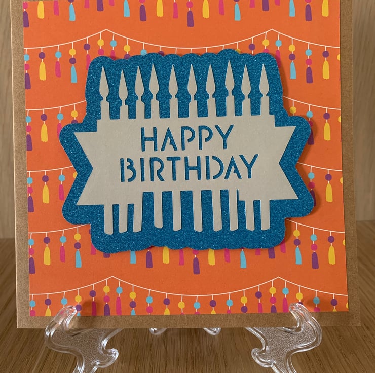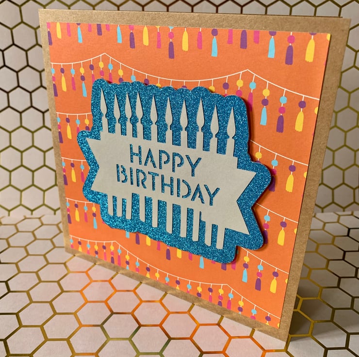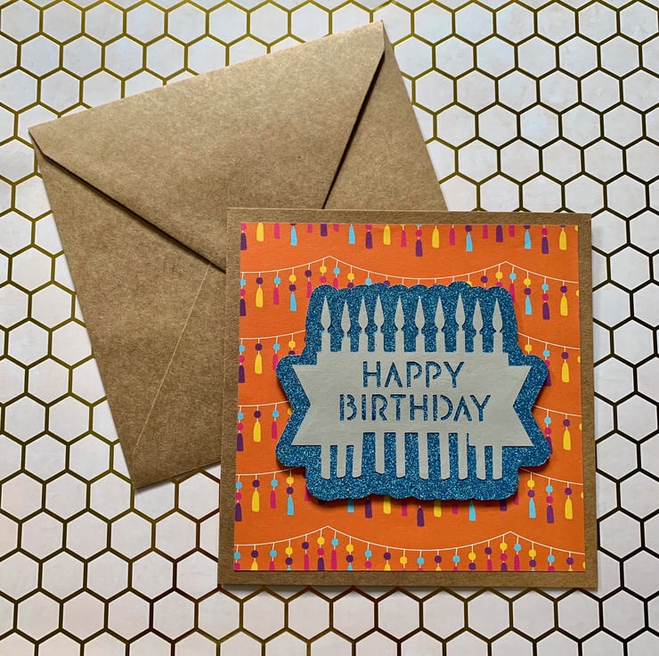 This is a bright and colourful fiesta themed Happy Birthday’ Card, made with a funky background and glitter card set on a Brown Kraft square card - 280gsm