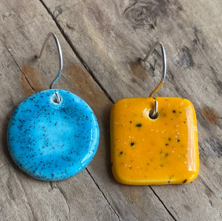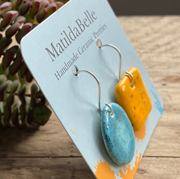 Each earring has been handmade and glazed using this fantastic rich Yolk Yellow on the Square and a stunning speckled Blue on the Circle.