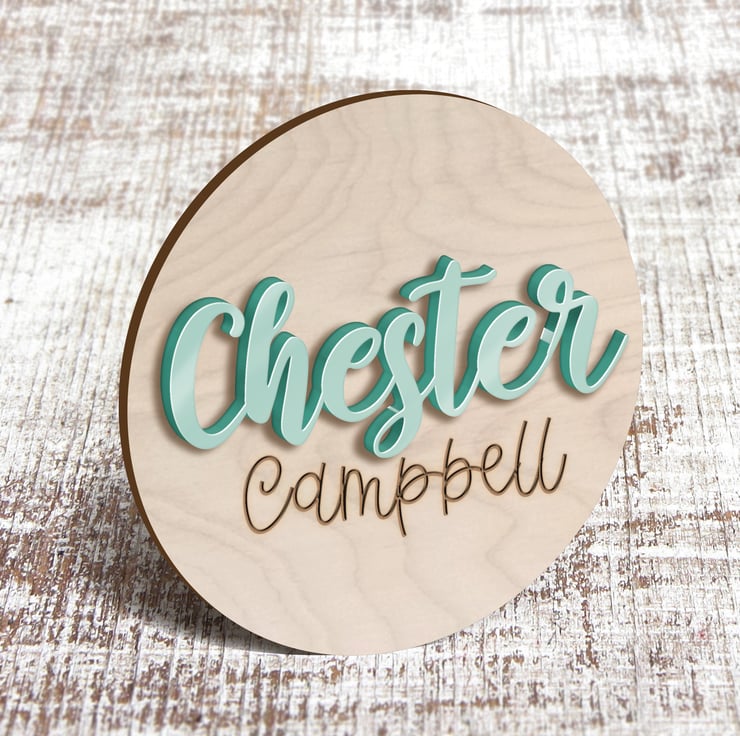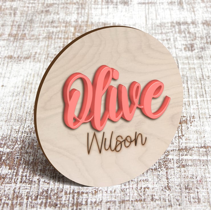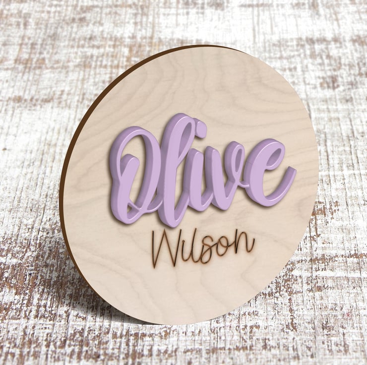 10cm Birch Wood Disc with First Name Intricately laser cut from 3mm Recycled Acrylic. Baby's surname is laser etched into the surface of the wooden disc.